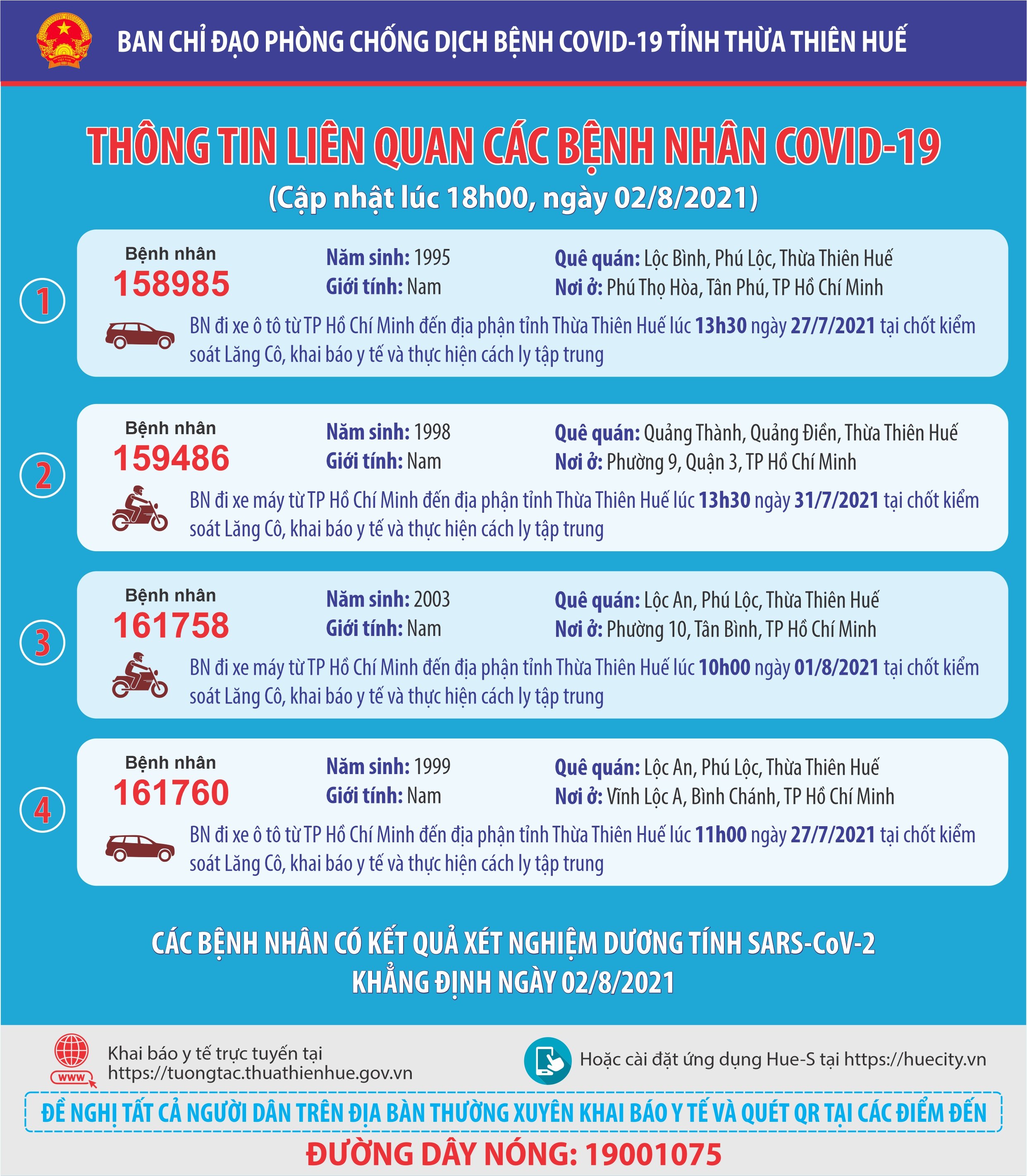 Thông báo của Ban chỉ đạo phòng chống dịch bệnh Covid-19 tỉnh Thừa Thiên Huế ( cập nhật lúc 18 giờ ngày 02 tháng 8 năm 2021) Thông tin liên quan các bệnh nhân Covid-19