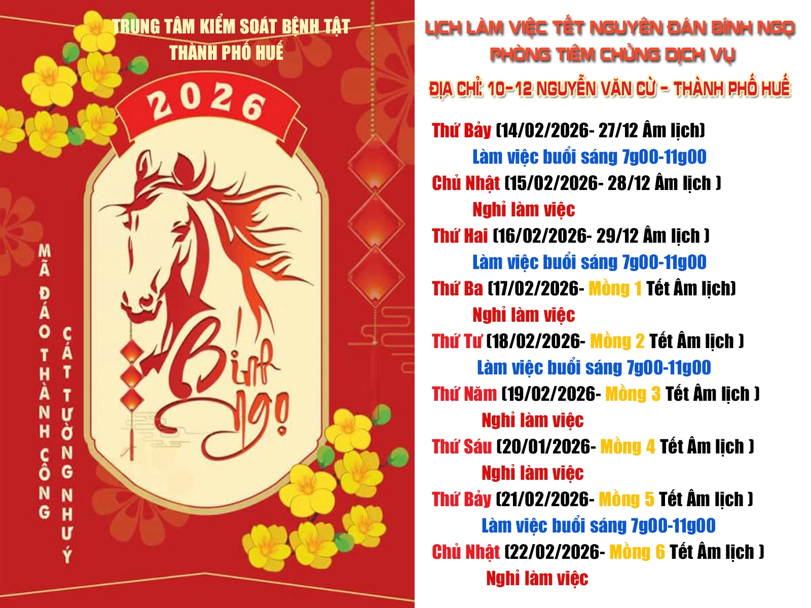 Lịch làm việc Tết Nguyên đán Bính Ngọ của Phòng Tiêm chủng dịch vụ- Trung tâm Kiểm soát bệnh tật thành phố Huế