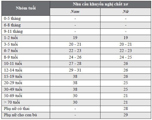 Bảng: Nhu cầu khuyến nghị chất xơ (g/ngày)