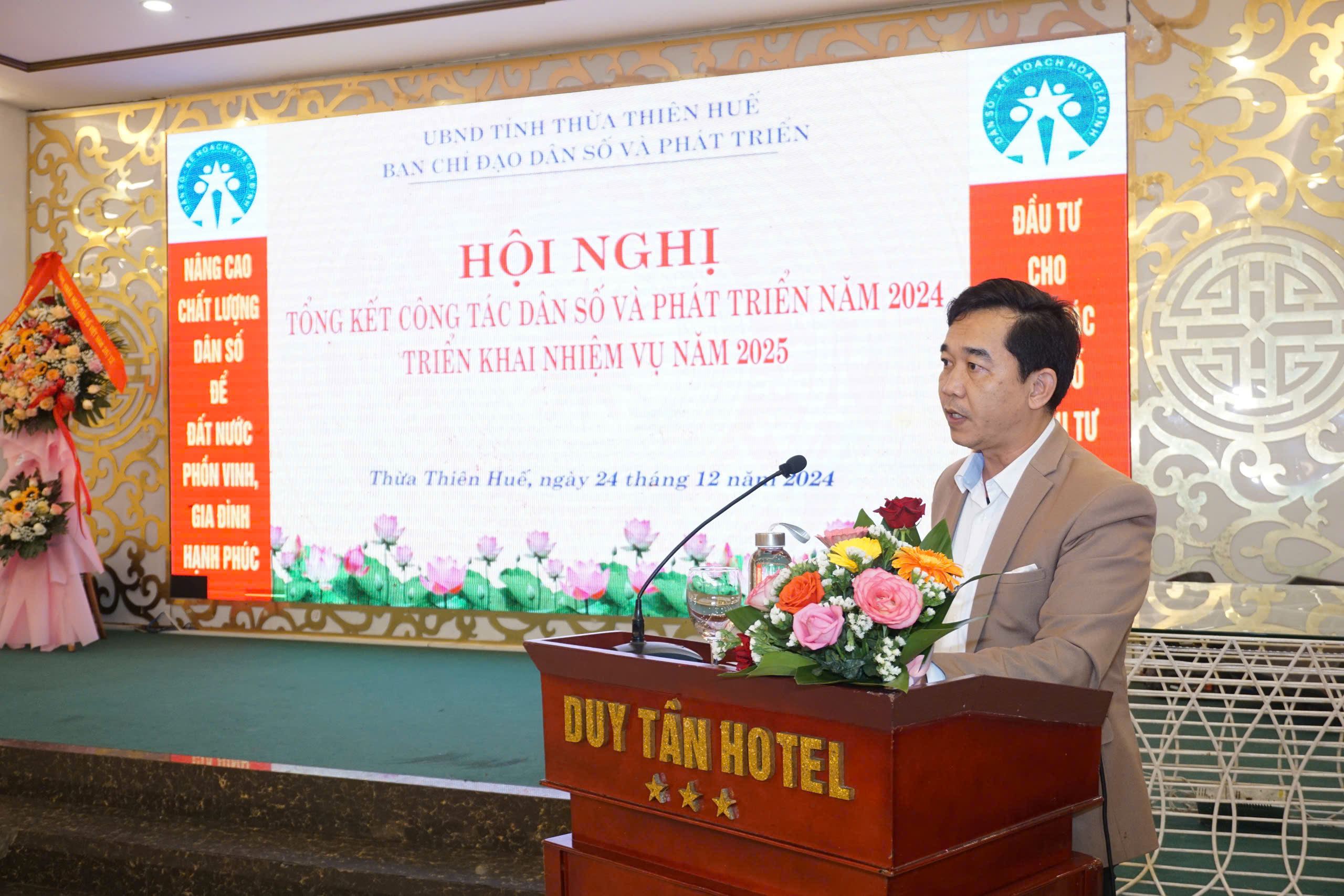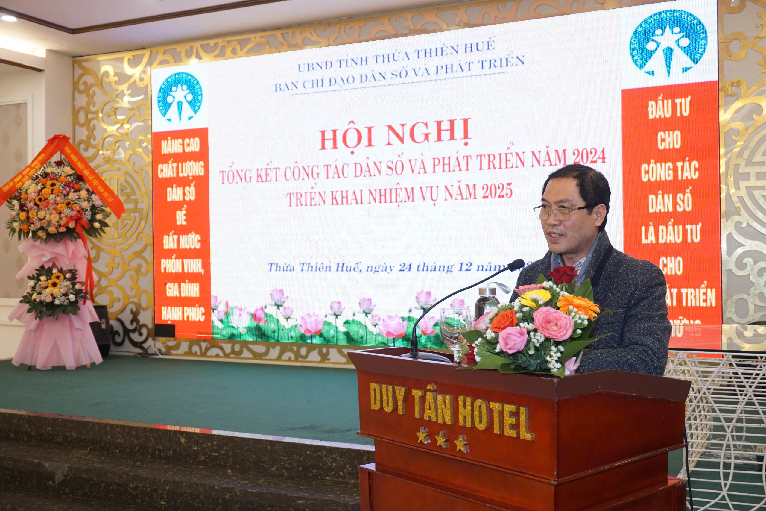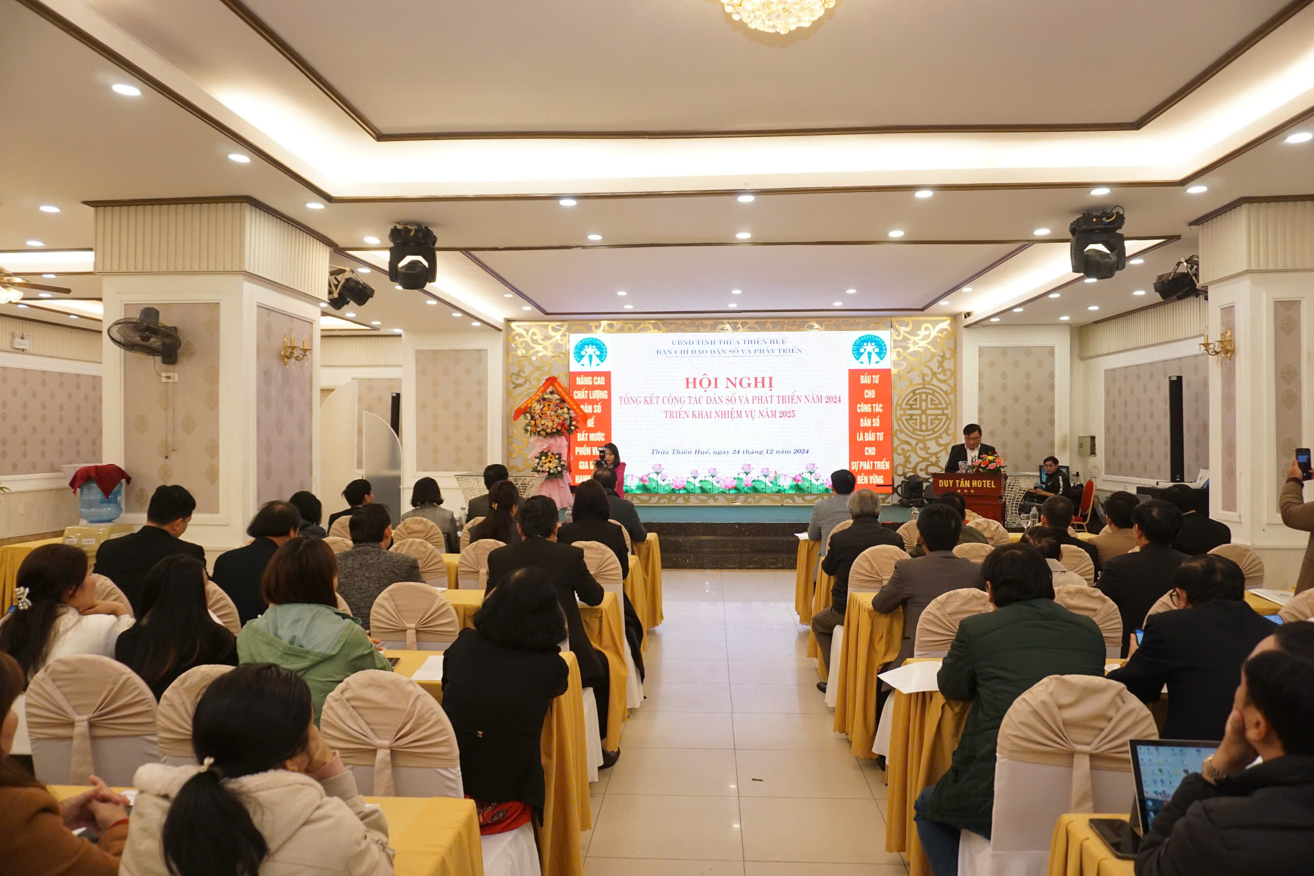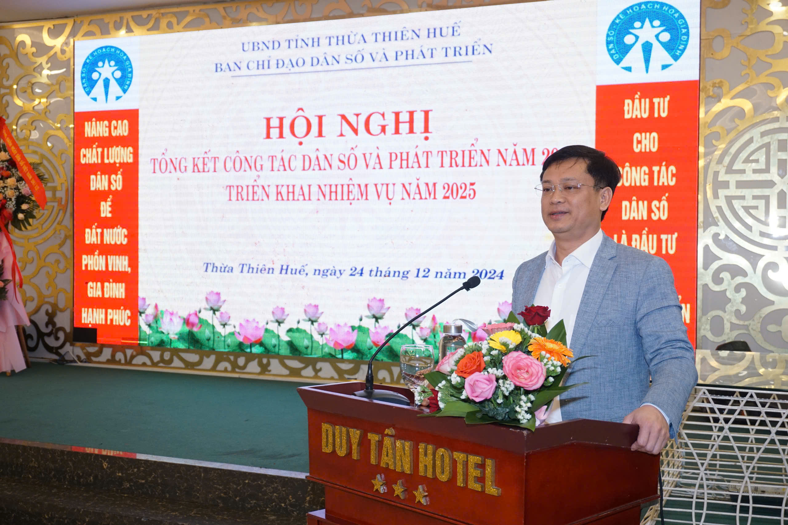 Chiều ngày 24/12/2024, được sự nhất trí của Ủy ban nhân dân tỉnh, Ban chỉ đạo công tác dân số và phát triển đã tổ chức Hội nghị tổng kết hoạt động công tác dân số và phát triển năm 2024, triển khai nhiệm vụ năm 2025. Đến tham dự và chỉ đạo Hội nghị có đồng chí Nguyễn Thanh Bình - Ủy viên Thường vụ Tỉnh ủy - Phó Chủ tịch Thường trực Ủy ban nhân dân tỉnh tỉnh - Trưởng ban chỉ đạo công tác dân số và phát triển; PGS.TS Trần Kiêm Hảo - Giám đốc Sở Y tế - Phó trưởng Ban chỉ đạo công tác dân số và phát triển; đại diện lãnh đạo Uỷ ban Mặt trận Tổ quốc Việt Nam tỉnh, Ủy ban Kiểm tra Tỉnh ủy, Ban Tuyên giáo Tỉnh ủy, Ban Dân vận Tỉnh ủy, Ban Văn hóa xã hội - HĐND tỉnh, Văn phòng HĐND tỉnh, Văn phòng Đoàn Đại biểu Quốc hội tỉnh, UBND tỉnh; Bệnh viện Trung ương Huế, Trường Đại học Y Dược Huế, Trung tâm Sàng lọc - Chẩn đoán trước sinh và sơ sinh thuộc Trường Đại học Y dược Huế; các thành viên Ban chỉ đạo công tác dân số và phát triển; đại diện lãnh đạo và các phòng môn thuộc Sở Y tế, Chi cục Dân số, đại diện lãnh đạo các đơn vị trực thuộc ngành Y tế, Hội Kế hoạch hóa Gia đình tỉnh; Ủy ban nhân dân các huyện, thị xã, thành phố Huế và các tập thể, cá nhân có thành tích xuất sắc trong công tác dân số và phát triển, mô hình xã, phường, cụm dân cư không có người sinh con thứ 3 trở lên giai đoạn 2021-2024,...