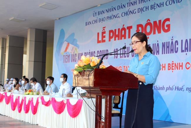 PGS.TS. Trần Kiêm Hảo - Giám đốc Sở Y tế phát biểu tại lễ phát động: “Hôm nay, Ban chỉ đạo phòng, chống dịch bệnh Covid-19 tỉnh tổ chức Lễ phát động “Chiến dịch tiêm vaccin phòng Covid-19 liều cơ bản và nhắc lại” năm 2022. Đây là dịp để tất cả chúng ta, từ những nhà lãnh đạo các cấp, đến người dân trong cộng đồng một lần nữa góp phần nâng cao nhận thức, tiếp tục khơi dậy tinh thần tích cực, tự giác trong việc thực hiện tiêm chủng mũi 3, mũi 4, nhằm tăng cường thêm khả năng miễn dịch trước nguy cơ bùng phát trở lại của dịch bệnh Covid-19 ở Thừa Thiên Huế, góp phần quan trọng trong sự nghiệp bảo vệ và nâng cao sức khỏe nhân dân. Hiện nay, việc tiêm vắc-xin phòng Covid-19 mũi bổ sung và mũi nhắc lại được Sở Y tế triển khai trên toàn tỉnh, điểm tiêm thường xuyên tại Trung tâm Kiểm soát bệnh tật tỉnh, Trung tâm Y tế các huyện, thị xã và thành phố Huế, các trạm y tế xã/phường/thị trấn và các tổ tiêm chủng lưu động tại trường học, khu công nghiệp.... Tôi tin tưởng và mong muốn mọi người dân hưởng ứng với tinh thần yêu nước, đoàn kết, vượt khó, chúng ta sẽ tiếp tục đồng tâm, đồng sức sớm thực hiện tiêm mũi bổ sung và mũi nhắc lại, góp phần thực hiện thắng lợi mục tiêu phòng chống dịch bệnh Covid-19 trên địa bàn tỉnh nhà”.