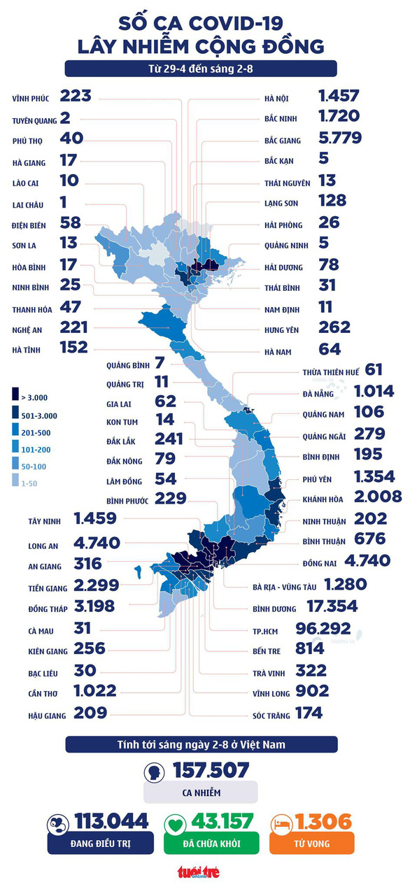 - Tính đến sáng ngày 02/8, Việt Nam có 157.507 ca nhiễm trong đó có 2.265 ca nhập cảnh và 155.242 ca mắc trong nước.