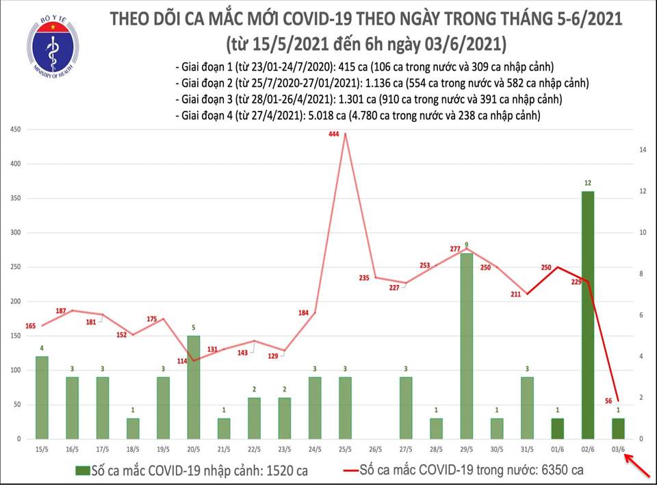 - Bản tin sáng của Bộ Y tế cho biết, tính từ 18 giờ ngày 03/6/2021 đến 6 giờ ngày 3/6/2021, Việt Nam có 57 ca mắc mới (BN7814-7870), bao gồm một ca cách ly ngay sau khi nhập cảnh tại Tây Ninh và 56 ca ghi nhận trong nước tại Bắc Giang (32), Bắc Ninh (20), Lạng Sơn (3), Hải Dương (1).
