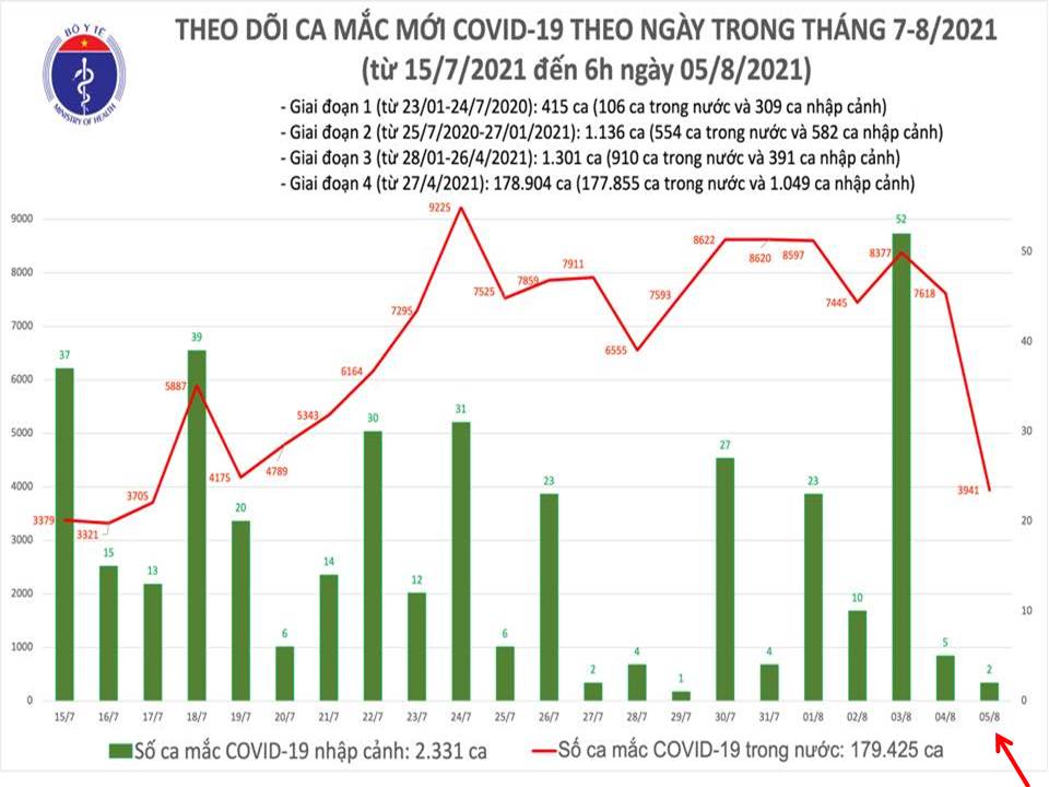 Theo Bộ Y tế, tính từ 18h30 ngày 4/8 đến 6h ngày 5/8 trên Hệ thống Quốc gia quản lý ca bệnh COVID-19 ghi nhận 3.943 ca nhiễm mới, trong đó 2 ca nhập cảnh và 3.941 ca ghi nhận trong nước (giảm 326 ca so với sáng hôm qua) tại: TP. Hồ Chí Minh (2.349), Bình Dương (497), Tây Ninh (235), Long An (189), Tiền Giang (169), Đồng Nai (110), Đà Nẵng (92), Bà Rịa - Vũng Tàu (66), Vĩnh Long (58), Bình Định (35), Đồng Tháp (32), An Giang (21), Sóc Trăng (20), Phú Yên (17), Kiên Giang (12), Đắk Lắk (9), Quảng Bình (9), Trà Vinh (9), Bạc Liêu (6), Lạng Sơn (2), Thanh Hóa (1), Lâm Đồng (1), Quảng Trị (1), Hà Tĩnh (1) trong đó có 1.008 ca trong cộng đồng.