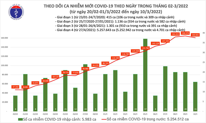 Bản tin phòng chống dịch COVID-19 ngày 10/3 của Bộ Y tế cho biết có 160.676 ca mắc COVID-19 mới, giảm gần 4.000 F0 so với hôm qua. Đây là lần đầu tiên số mắc mới trong ngày giảm so với ngày trước đó thay vì liên tiếp gia tăng như thời gian qua; Bình Định, Thanh Hoá và Vĩnh Phúc bổ sung hơn 57.000 F0. Trong ngày 09/3 có 244.960 liều vaccine phòng COVID-19 được tiêm. Như vậy, tổng số liều vắc xin đã được tiêm là 198.904.850 liều, trong đó: