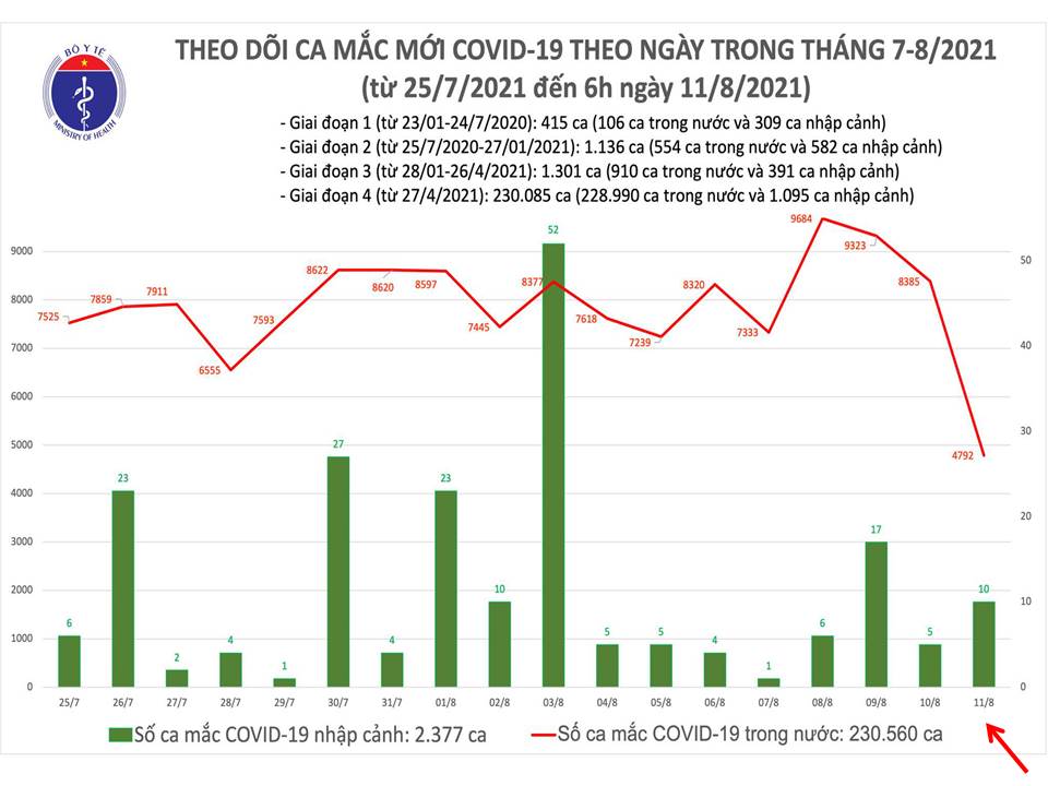- Tính đến sáng ngày 11/8, Việt Nam có 232.937 ca nhiễm trong đó có 2.377 ca nhập cảnh và 230.560 ca nhiễm trong nước.