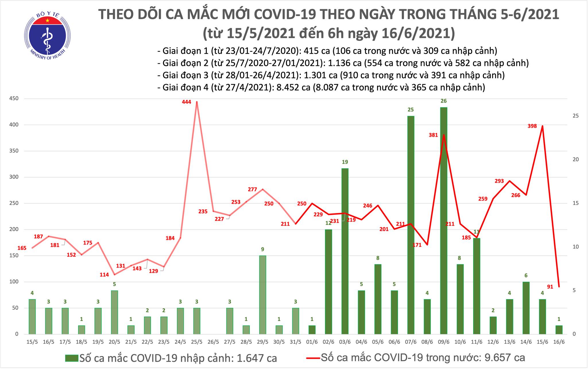- Việt Nam có tổng cộng 9.657 ca ghi nhận trong nước và 1.647 ca nhập cảnh.