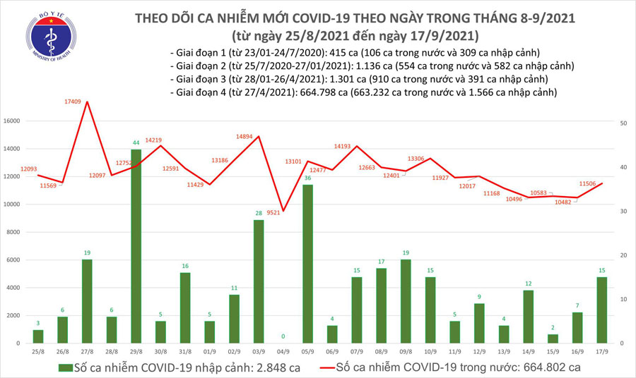 Bản tin tối 17-9 của Bộ Y tế cho biết cả nước ghi nhận thêm 11.521 ca mắc mới, tăng 1.024 ca so với hôm qua, gồm TP.HCM tăng 237 ca, Bình Dương tăng 1.015 ca. Hà Nội ngày 17-9 chỉ ghi nhận 12 ca mắc và là số mắc mới thấp nhất từ 17-7.