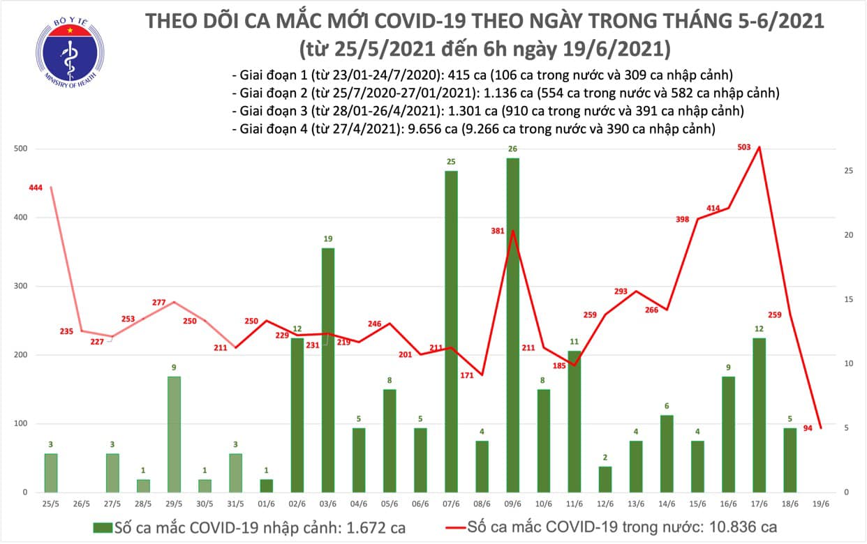 Tính từ 18h ngày 18/6 đến 6h ngày 19/6 có 94 ca mắc mới (BN12415-12508):