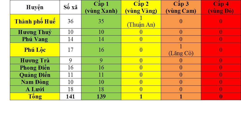 Phân loại nguy cơ tại các địa phương (đến cấp xã): Tỉnh Thừa Thiên Huế đang ở mức cấp 2 (vùng vàng):