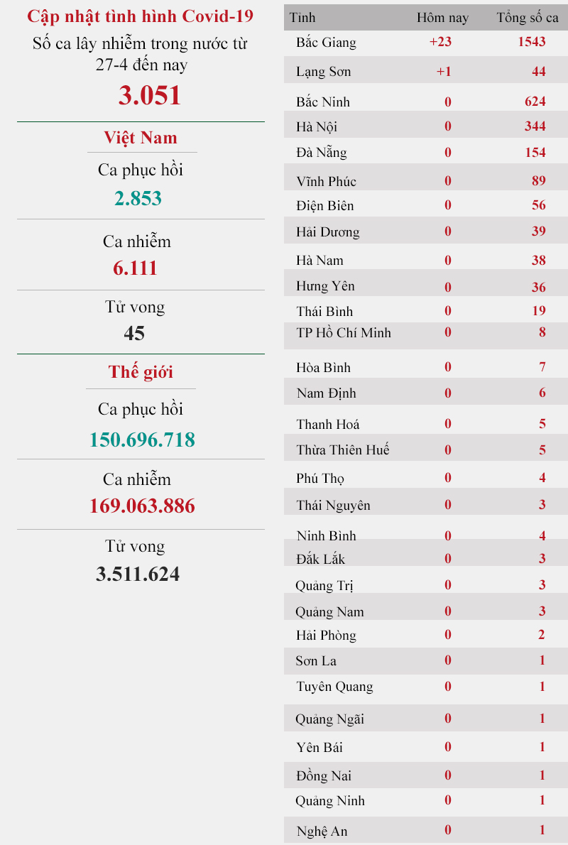 - Cả thế giới có 169.063.886 ca mắc, trong đó 150.696.718 đã khỏi bệnh; 3.511.624 tử vong.