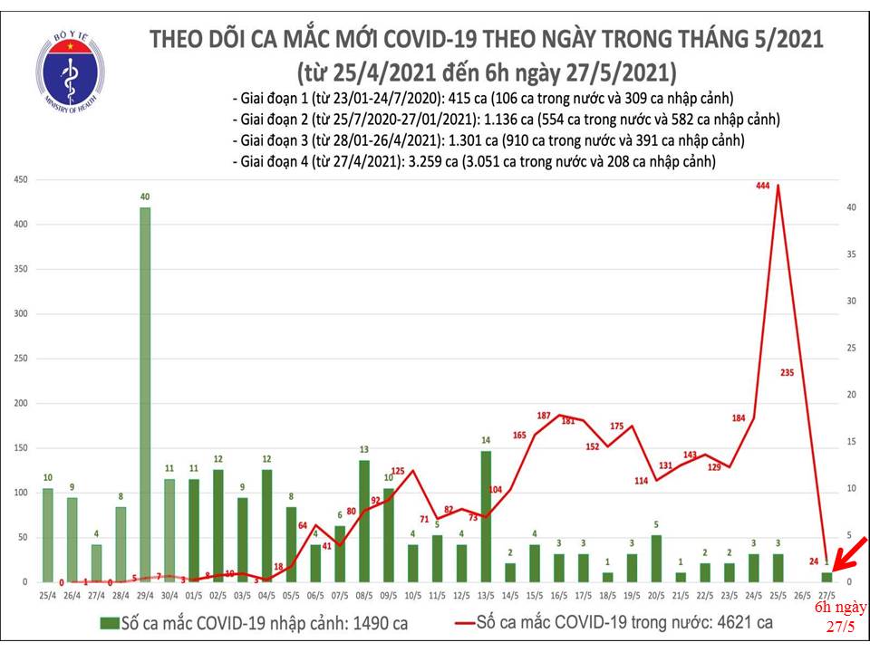 - Số lượng ca mắc mới tính từ ngày 27/4/2021 đến 27/5/2021: 3.051 ca.