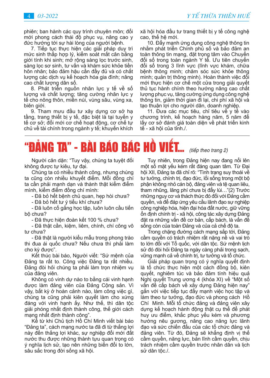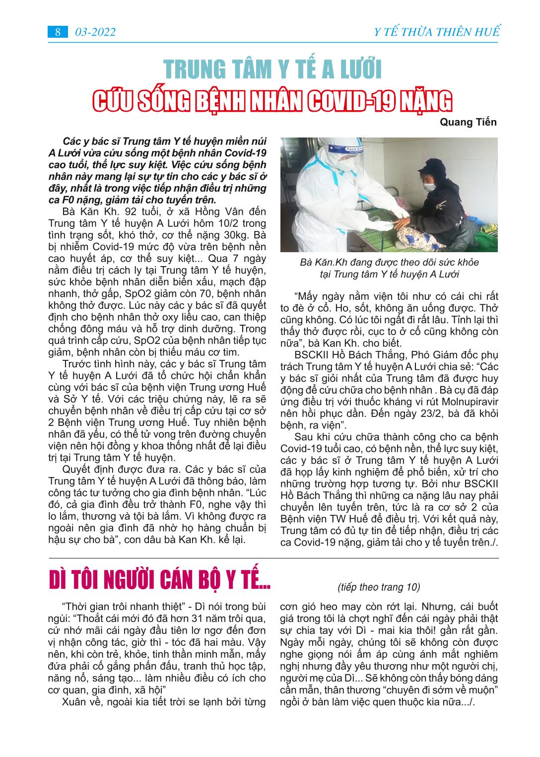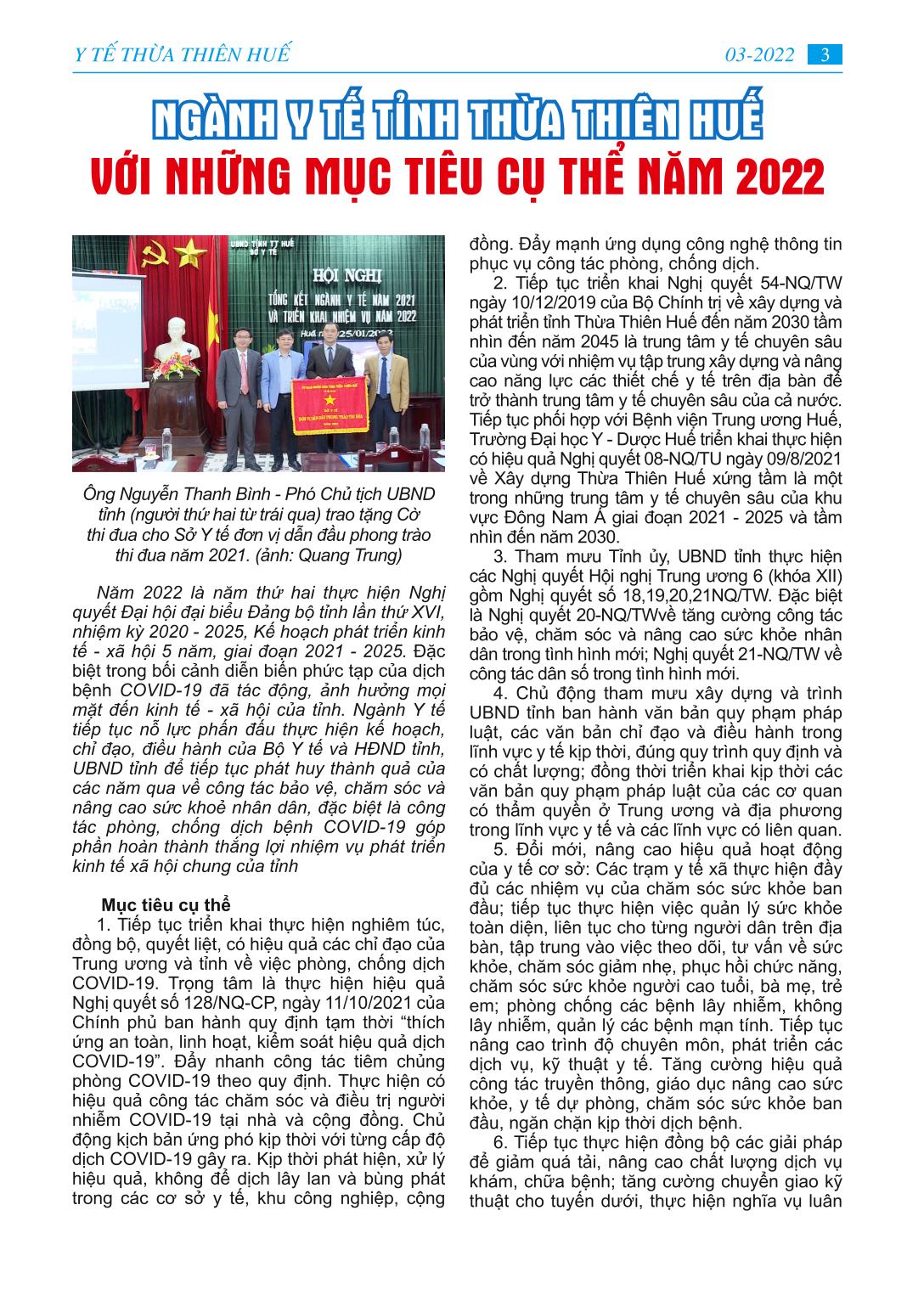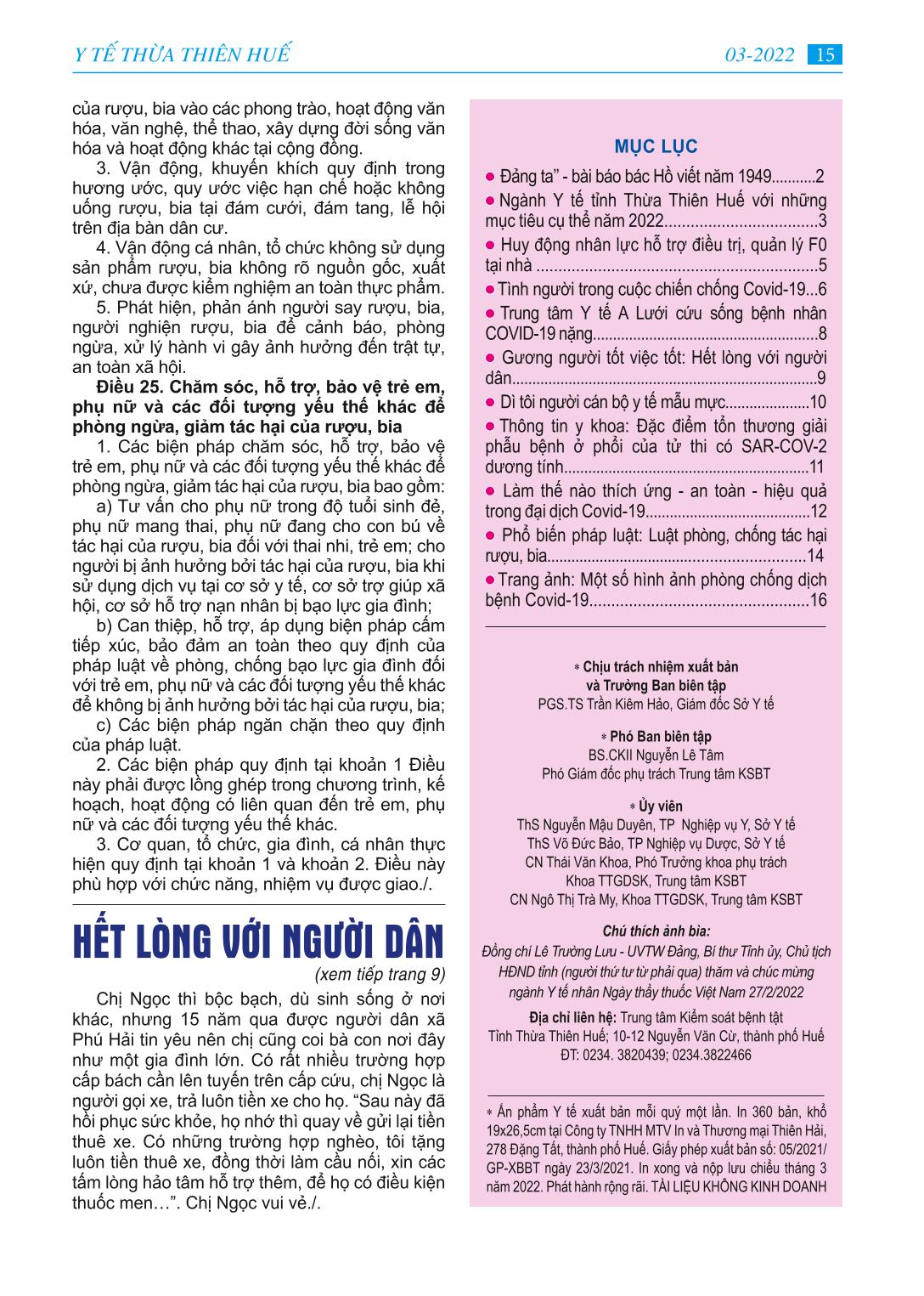 MỤC LỤC - Học tập và làm theo tư tưởng, đạo đức, phong cách Hồ Chí Minh “Đảng ta’’ - bài báo bác Hồ viết năm 1949 - Ngành Y tế tỉnh Thừa Thiên Huế với những mục tiêu cụ thể năm 2022 - Huy động lực lượng y tế hỗ trợ điều trị F0 tại nhà -Tình người trong cuộc chiến chống Covid-19 -Trung tâm Y tế A Lưới cứu sống người bệnh COVID-19 cao tuổi -Gương gười tốt việc tốt: Hết lòng với người dân. - Dì tôi người cán bộ y tế mẫu mực -Thông tin y khoa: Đặc điểm tổn thương giải phẫu bệnh ở phổi của tử thi có SAR-COV-2 dương tính - Làm thế nào thích ứng - an toàn - hiệu quả trong đại dịch Covid-19 - Phổ biến pháp luật: Luật phòng, chống tác hại rượu, bia - Trang ảnh: Một số hình ảnh phòng chống dịch bệnh Covid-19