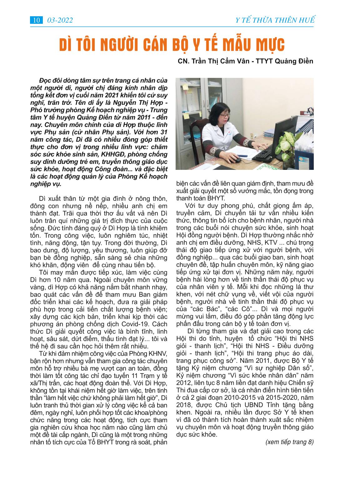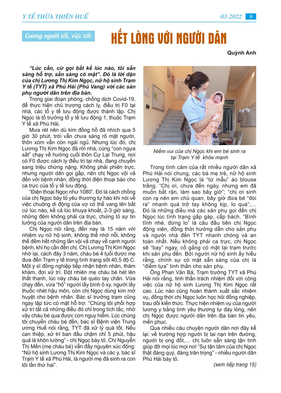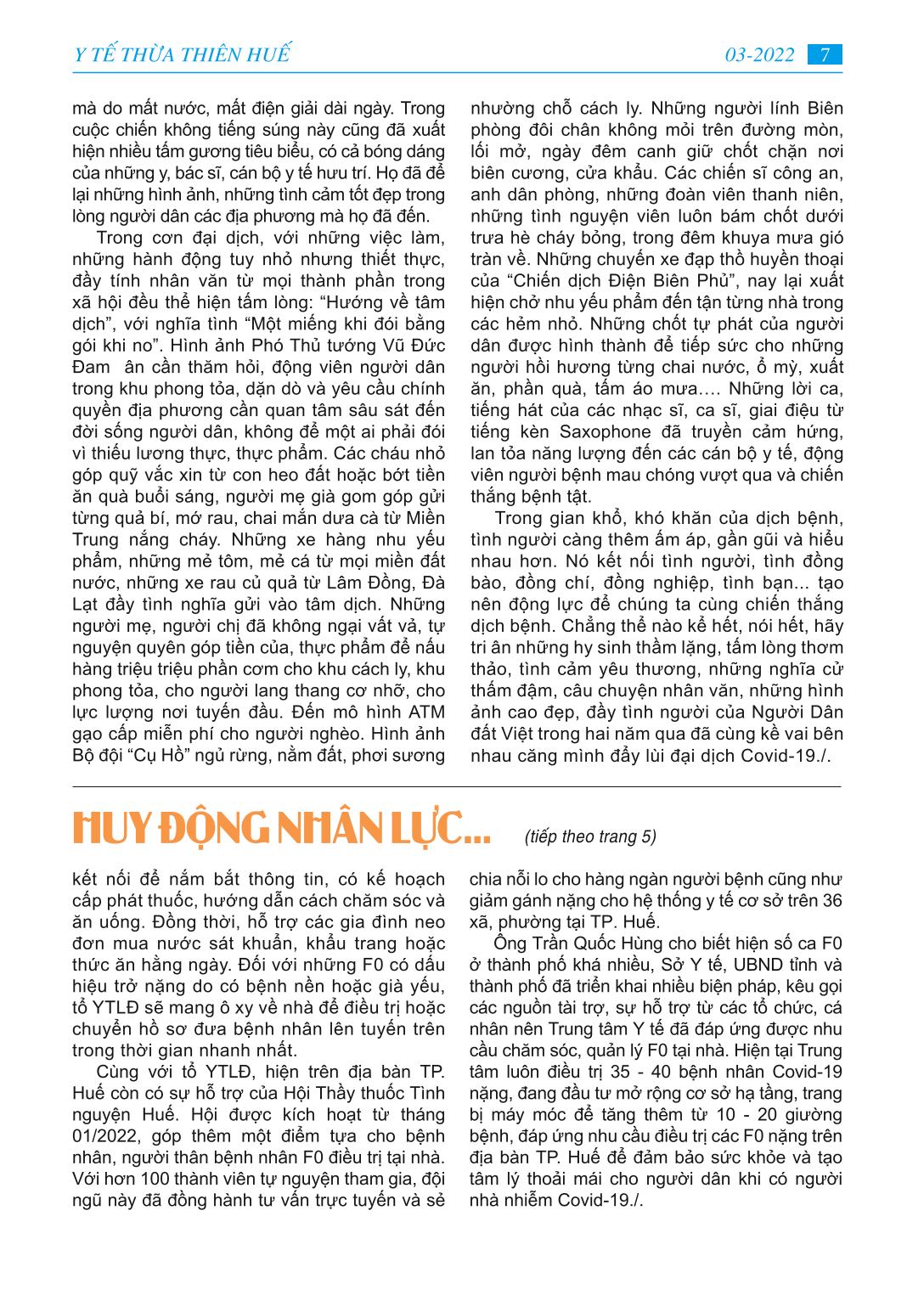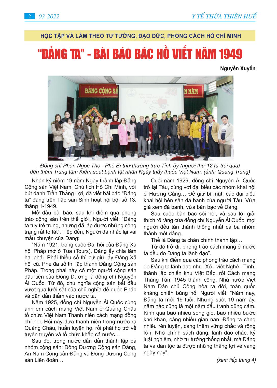 MỤC LỤC - Học tập và làm theo tư tưởng, đạo đức, phong cách Hồ Chí Minh “Đảng ta’’ - bài báo bác Hồ viết năm 1949 - Ngành Y tế tỉnh Thừa Thiên Huế với những mục tiêu cụ thể năm 2022 - Huy động lực lượng y tế hỗ trợ điều trị F0 tại nhà -Tình người trong cuộc chiến chống Covid-19 -Trung tâm Y tế A Lưới cứu sống người bệnh COVID-19 cao tuổi -Gương gười tốt việc tốt: Hết lòng với người dân. - Dì tôi người cán bộ y tế mẫu mực -Thông tin y khoa: Đặc điểm tổn thương giải phẫu bệnh ở phổi của tử thi có SAR-COV-2 dương tính - Làm thế nào thích ứng - an toàn - hiệu quả trong đại dịch Covid-19 - Phổ biến pháp luật: Luật phòng, chống tác hại rượu, bia - Trang ảnh: Một số hình ảnh phòng chống dịch bệnh Covid-19
