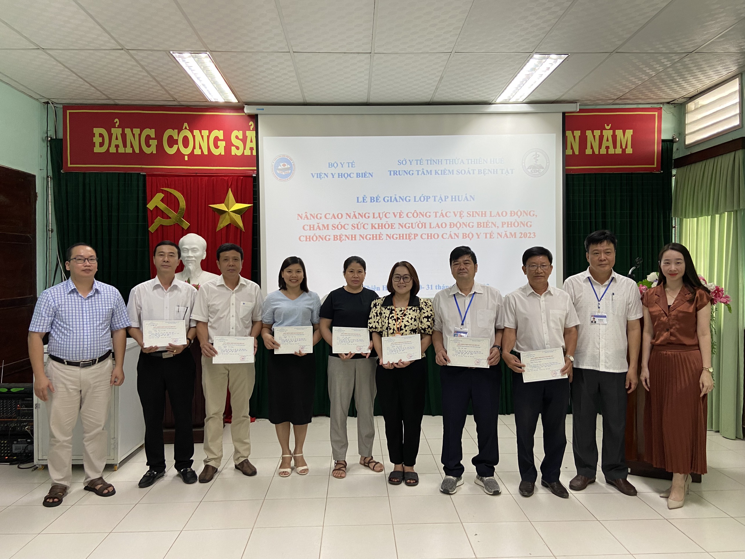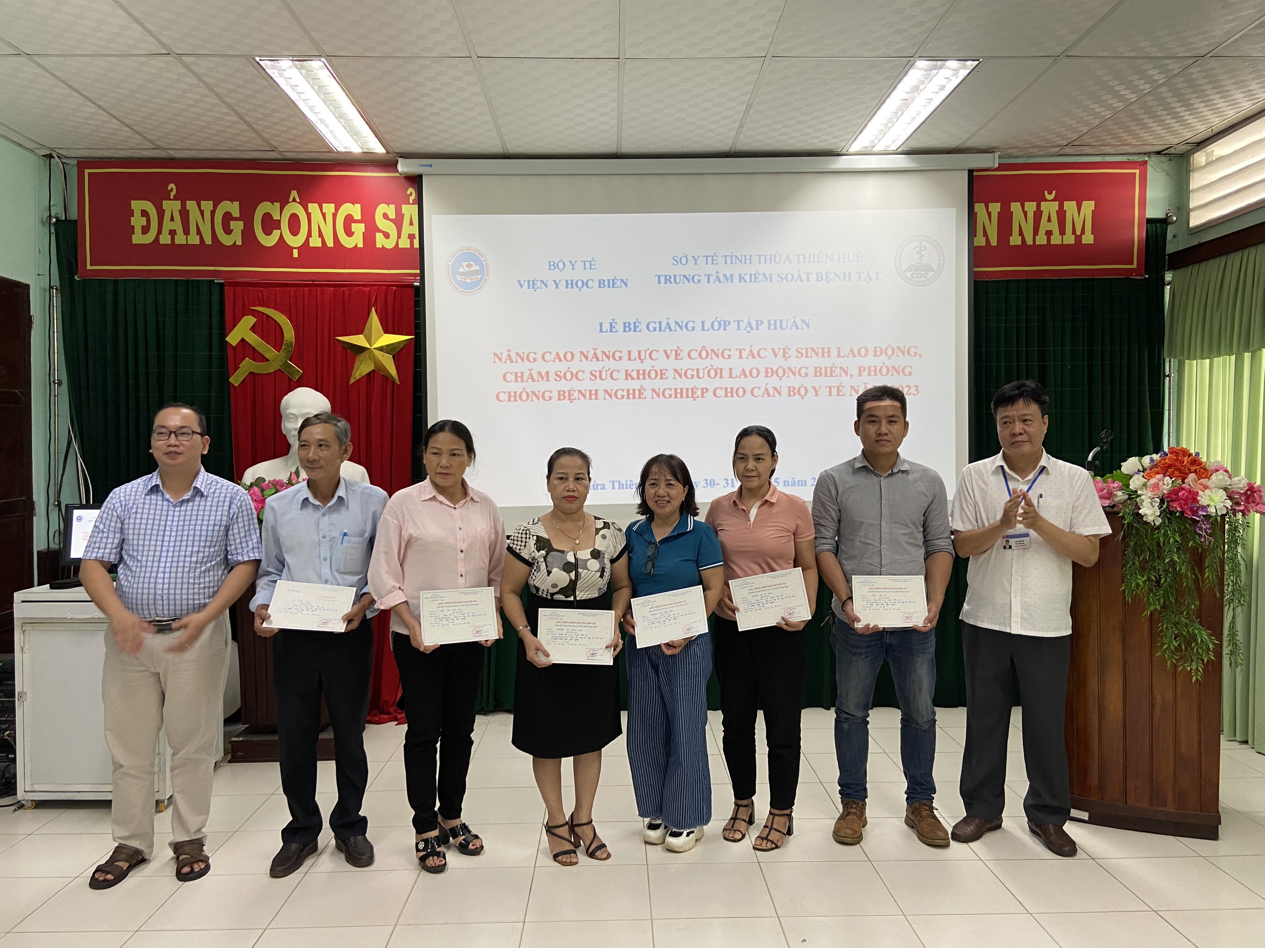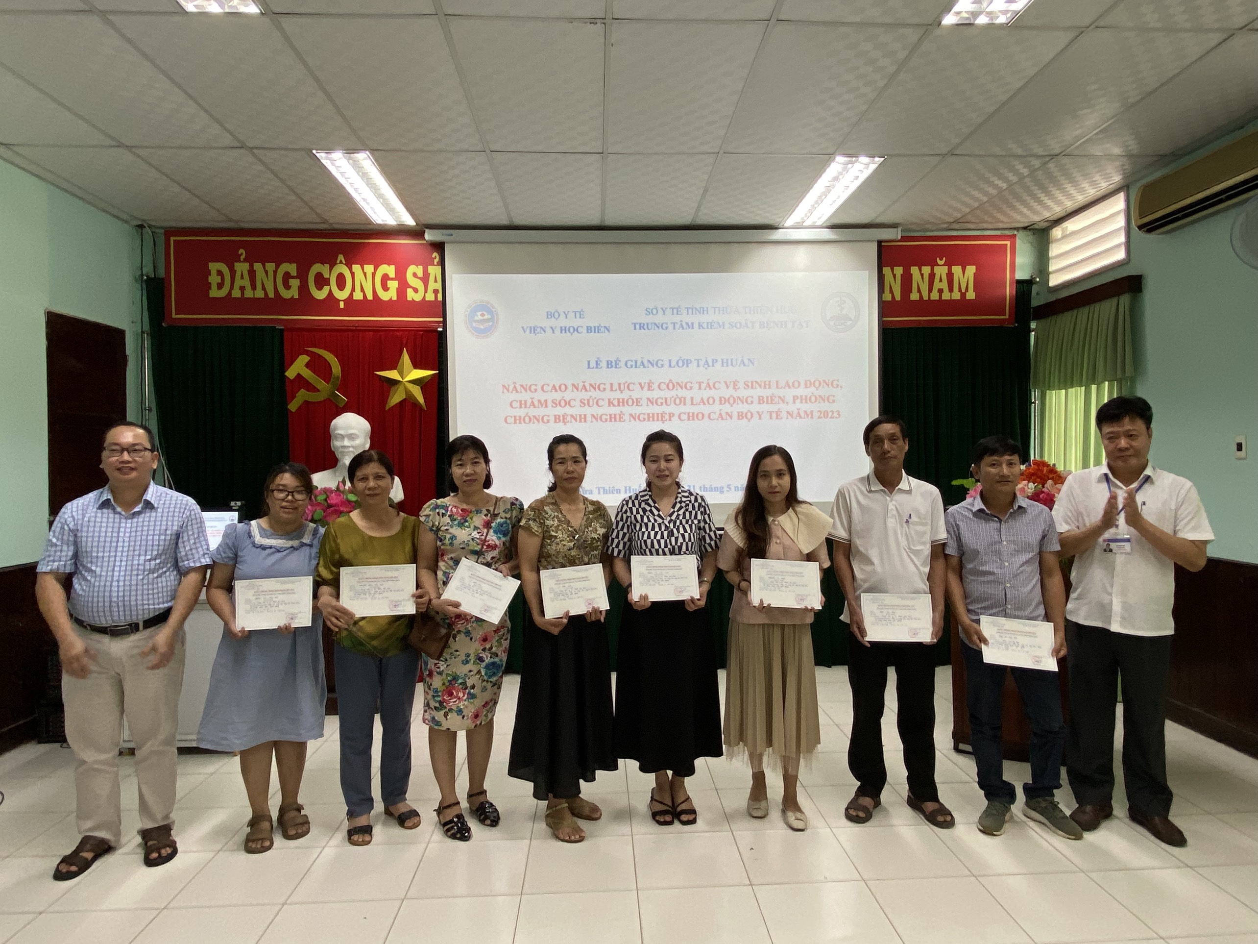 Chiều ngày 31/5/2023, Viện Y học Biển Việt Nam phối hợp với Trung tâm Kiểm soát bệnh tật tỉnh Thừa Thiên Huế tổ chức Bế giảng lớp Tập huấn, nâng cao năng lực về công tác vệ sinh lao động, chăm sóc sức khỏe người lao động vùng biển.