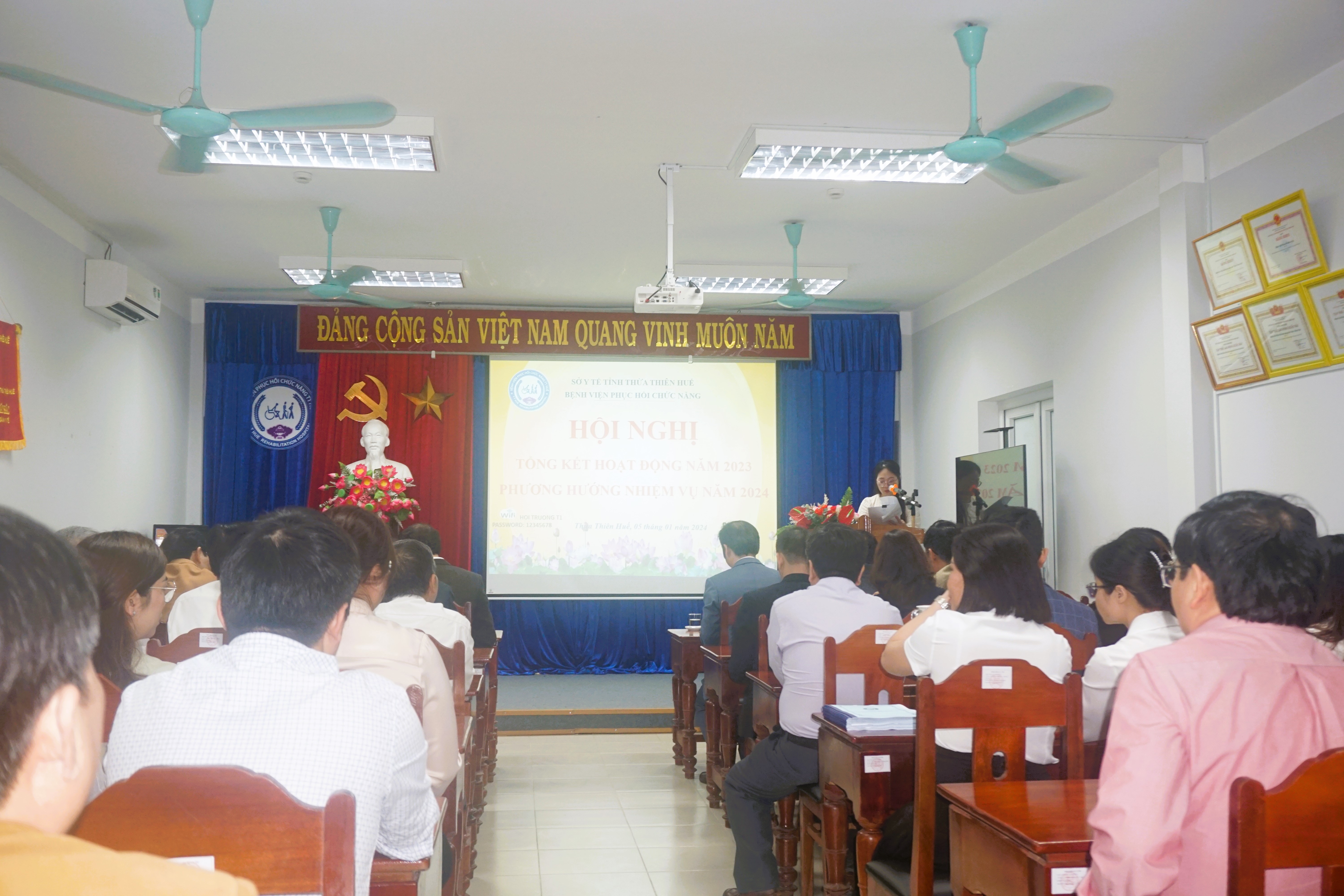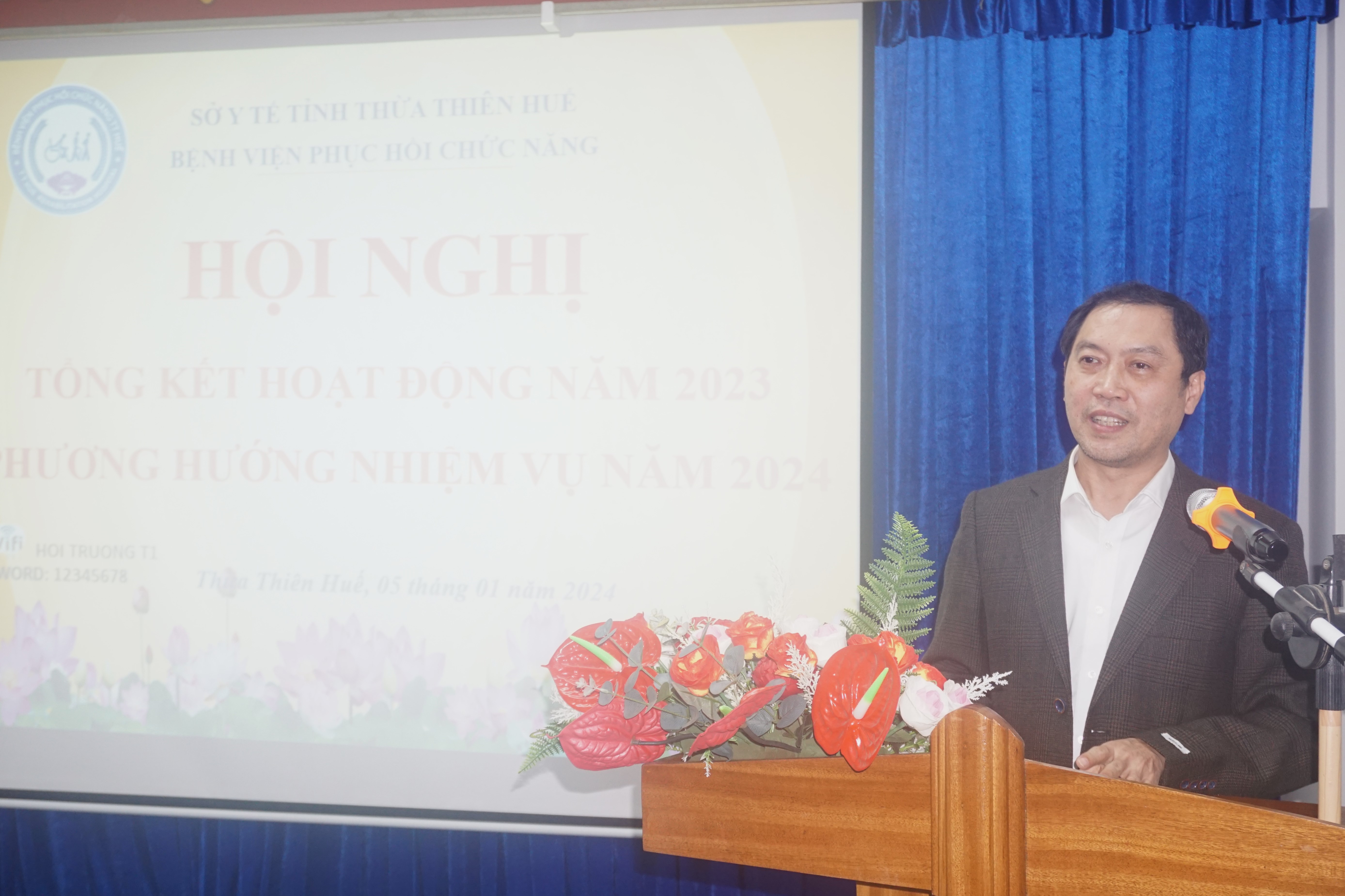 Chiều ngày 5/1/2024, Bệnh viện Phục hồi chức năng (PHCN) đã tổ chức Hội nghị tổng kết hoạt động năm 2023. Tham dự và chỉ đạo Hội nghị có PGS.TS.Trần Kiêm Hảo- Giám đốc Sở Y tế cùng lãnh đạo các phòng thuộc Sở; Đại diện Sở Lao động - Thương binh và Xã hội; Bảo hiểm xã hội tỉnh; Đại diện Lãnh đạo Khoa Phục hồi chức năng Bệnh viện Trung ương Huế; Bộ môn Phục hồi chức năng Trường Đại học Y Dược Huế; Bệnh viện Y học cổ truyền; Bệnh viện âm thần; Bệnh viện Giao thông vận tải; Đại diện Lãnh đạo Hội Người khuyết tật - Bảo trợ người khuyết tật và trẻ em mồ côi tỉnh; Đại diện của Tổ chức CCIHP, MCMV; Đại diện lãnh đạo và thư ký chương trình của 09 Trung tâm Y tế huyện/thị xã/thành phố.