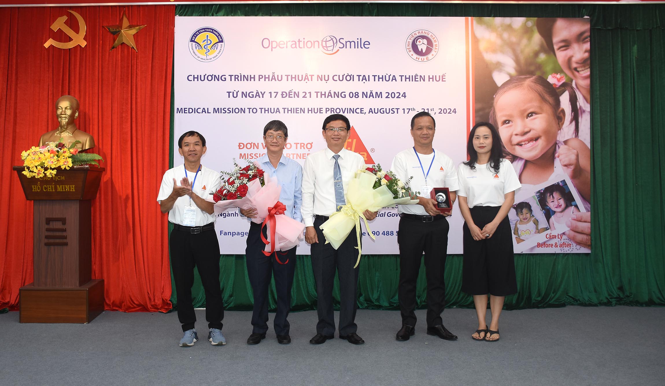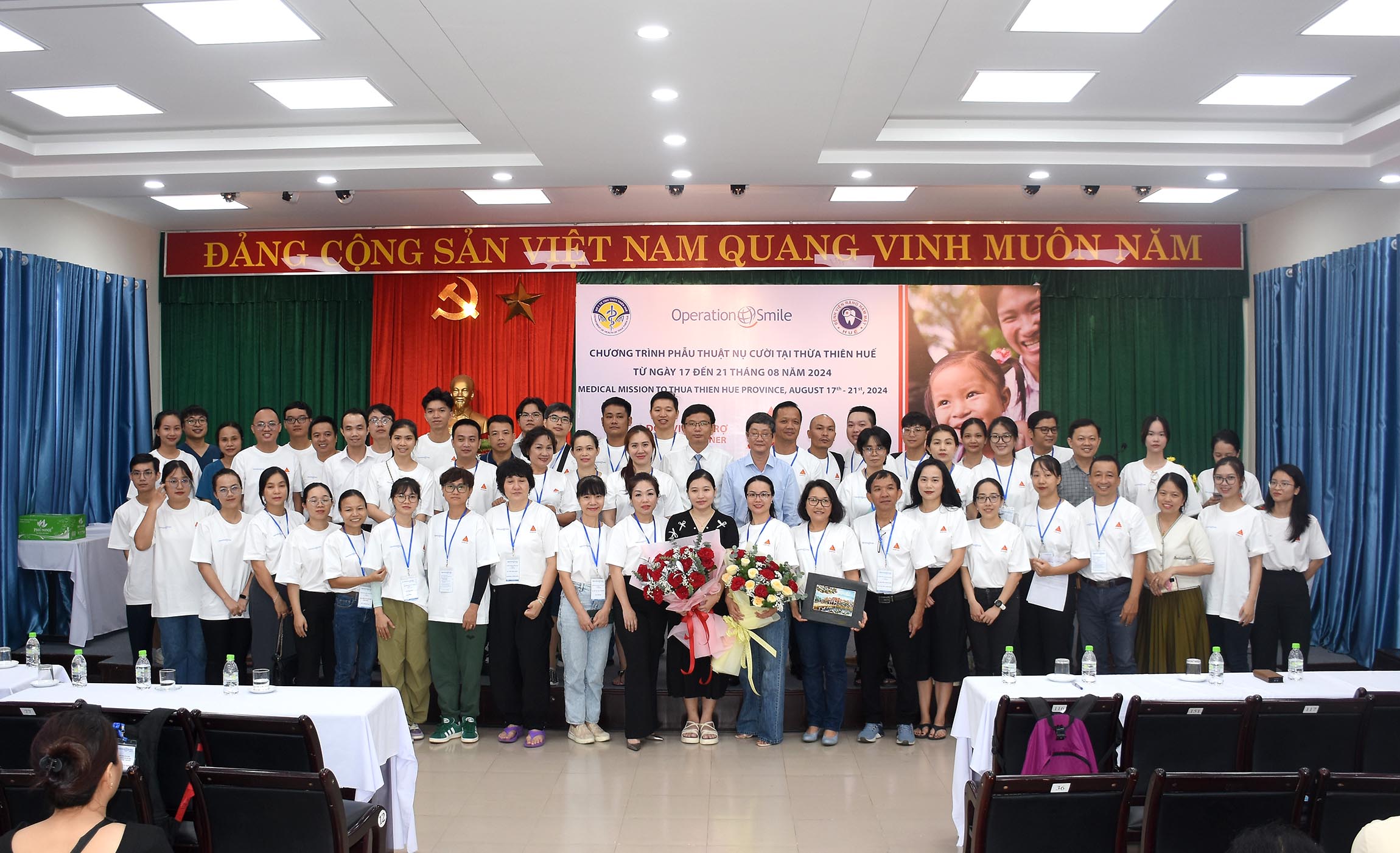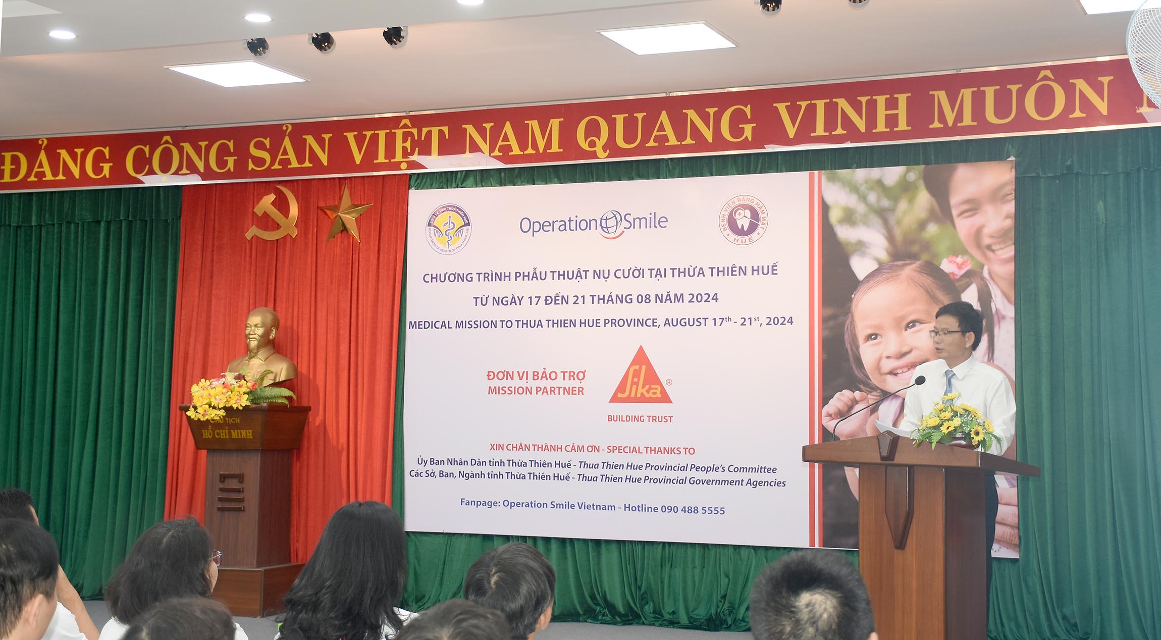 Sáng ngày 17/8, Bệnh viện Răng Hàm Mặt Huế phối hợp với Tổ chức Operation Smile Việt Nam khai mạc “Chương trình phẫu thuật nụ cười tại Thừa Thiên Huế”, Ban Giám đốc sở Y tế Thừa Thiên Huế, Tổ chức Operation Smile Việt Nam, Nhà tài trợ SIKA, lãnh đạo BV Răng Hàm Mặt - Huế, người nhà và các trẻ dị tật từ các tỉnh Miền Trung - Tây Nguyên cùng tham dự.