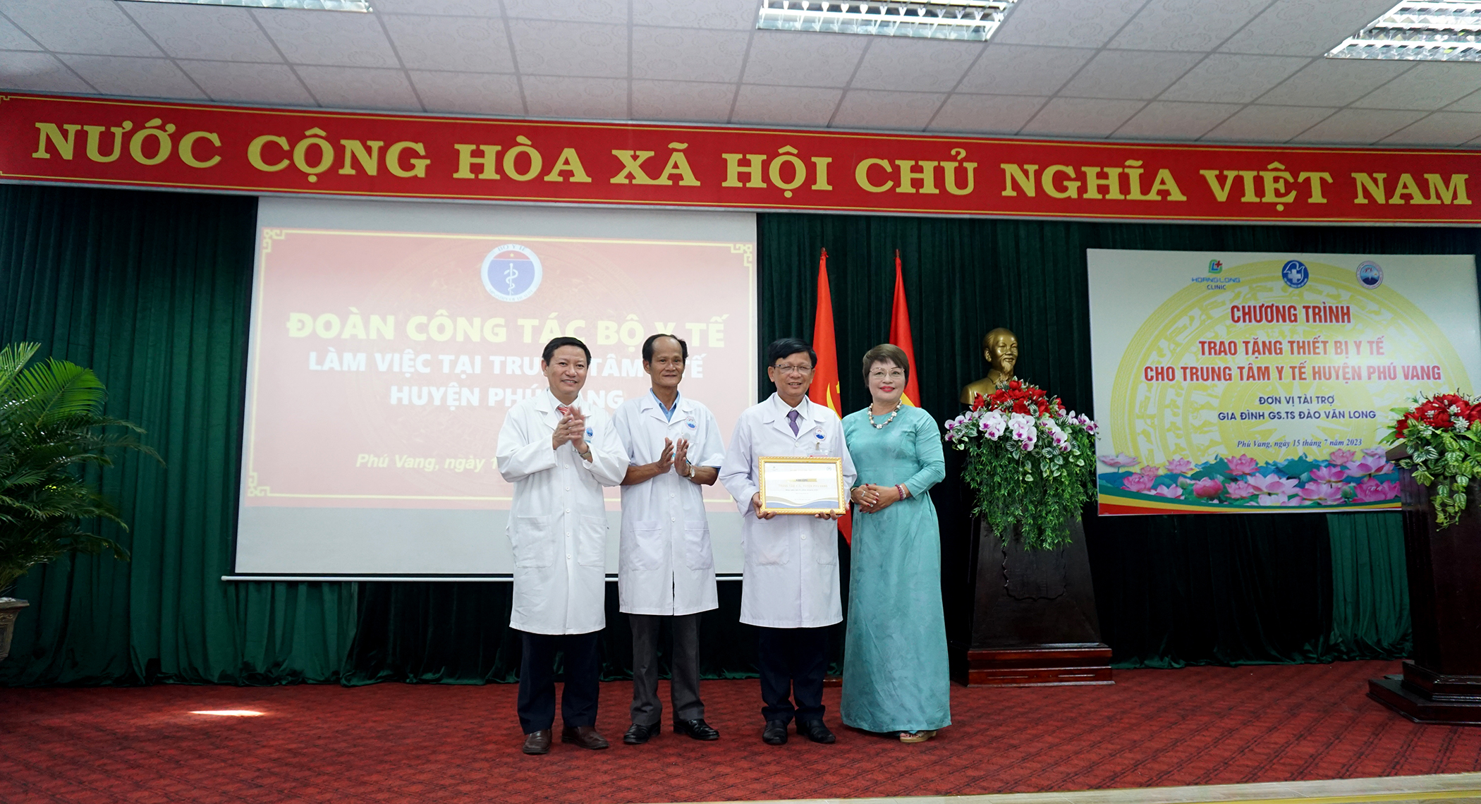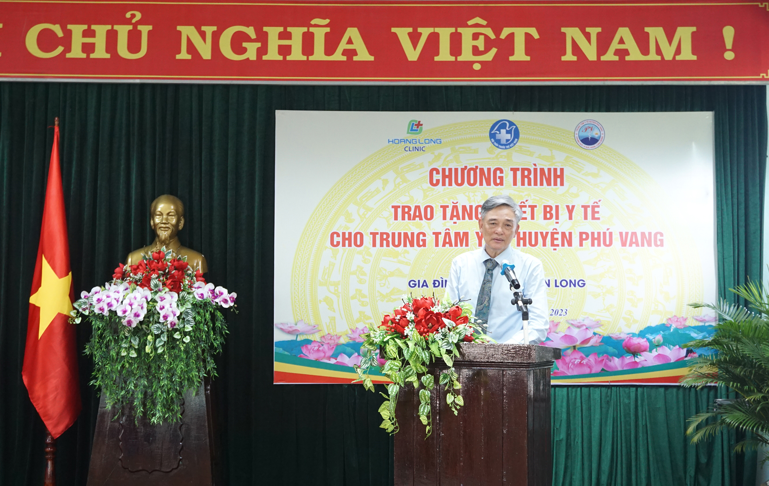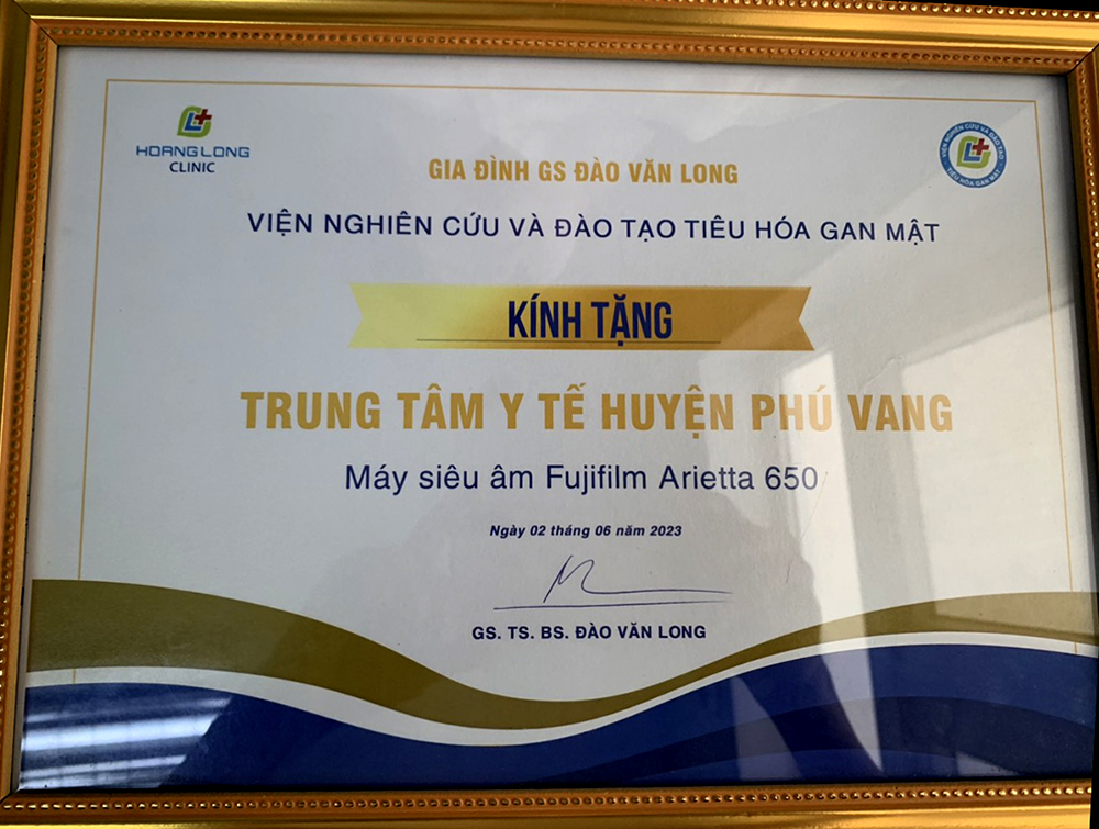 Dịp này, gia đình GS.TS Đào Văn Long, - Phó Chủ tịch Hội Tiêu hóa Việt Nam, nguyên Giám đốc BV Đại học Y Hà Nội, nguyên Phó hiệu trưởng Trường Đại học Y Hà Nội phối hợp cùng Công ty Cổ phần Y tế Hoàng Long và Viện Nghiên cứu và Đào tạo tiêu hóa gan mật, trao tặng cho TTYT huyện Phú Vang một máy Siêu âm Fujifiml Arietta 650 do Nhật Bản sản xuất. Đây là hệ thống máy siêu âm thế hệ mới được tích hợp công nghiệp trí tuệ nhân tạo; thiết bị đánh giá được độ cứng của các mô như gan, lách, tụy, định lượng mức độ nhiễm mỡ ở gan; phân loại và đánh giá mức độ tổn thương tuyến giáp và tuyến vú; một bộ máy vi tính, máy in cấu hình cao, hai hộp kìm sinh thiết nội soi, trị giá hơn 2 tỷ đồng. Ngoài ra BV Đại học Y Hà Nội, Viện Nghiên cứu và Đào tạo tiêu hóa gan mật tổ chức đào tạo miễn phí chuyên sâu về lý thuyết và thực hành siêu âm tổng quát và siêu âm đàn hồi mô cho bác sĩ chẩn đoán hình ảnh, góp phần nâng cao chất lượng, phát huy hiệu quả, sử dụng và bảo quản thiết bị mới, phục vụ công tác khám chữa bệnh tại địa phương.