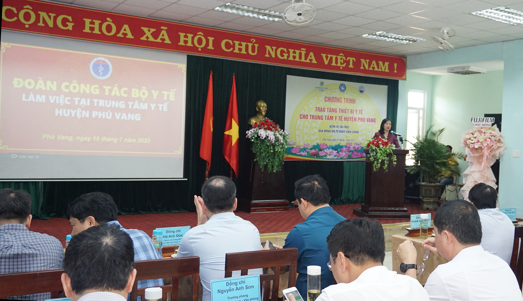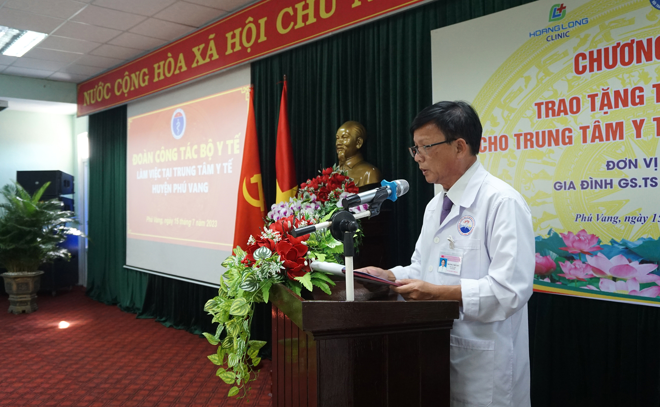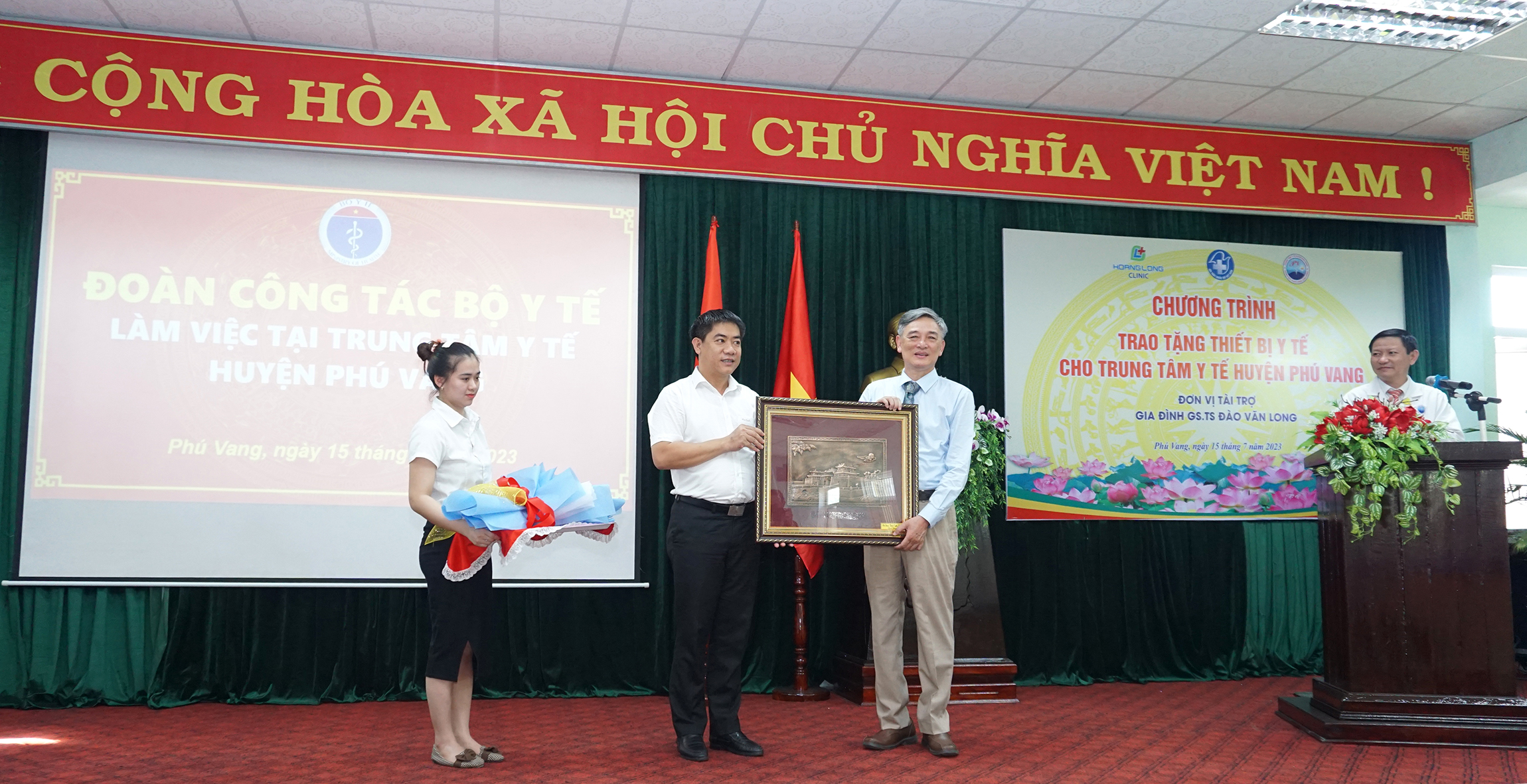 Dịp này, gia đình GS.TS Đào Văn Long, - Phó Chủ tịch Hội Tiêu hóa Việt Nam, nguyên Giám đốc BV Đại học Y Hà Nội, nguyên Phó hiệu trưởng Trường Đại học Y Hà Nội phối hợp cùng Công ty Cổ phần Y tế Hoàng Long và Viện Nghiên cứu và Đào tạo tiêu hóa gan mật, trao tặng cho TTYT huyện Phú Vang một máy Siêu âm Fujifiml Arietta 650 do Nhật Bản sản xuất. Đây là hệ thống máy siêu âm thế hệ mới được tích hợp công nghiệp trí tuệ nhân tạo; thiết bị đánh giá được độ cứng của các mô như gan, lách, tụy, định lượng mức độ nhiễm mỡ ở gan; phân loại và đánh giá mức độ tổn thương tuyến giáp và tuyến vú; một bộ máy vi tính, máy in cấu hình cao, hai hộp kìm sinh thiết nội soi, trị giá hơn 2 tỷ đồng. Ngoài ra BV Đại học Y Hà Nội, Viện Nghiên cứu và Đào tạo tiêu hóa gan mật tổ chức đào tạo miễn phí chuyên sâu về lý thuyết và thực hành siêu âm tổng quát và siêu âm đàn hồi mô cho bác sĩ chẩn đoán hình ảnh, góp phần nâng cao chất lượng, phát huy hiệu quả, sử dụng và bảo quản thiết bị mới, phục vụ công tác khám chữa bệnh tại địa phương.