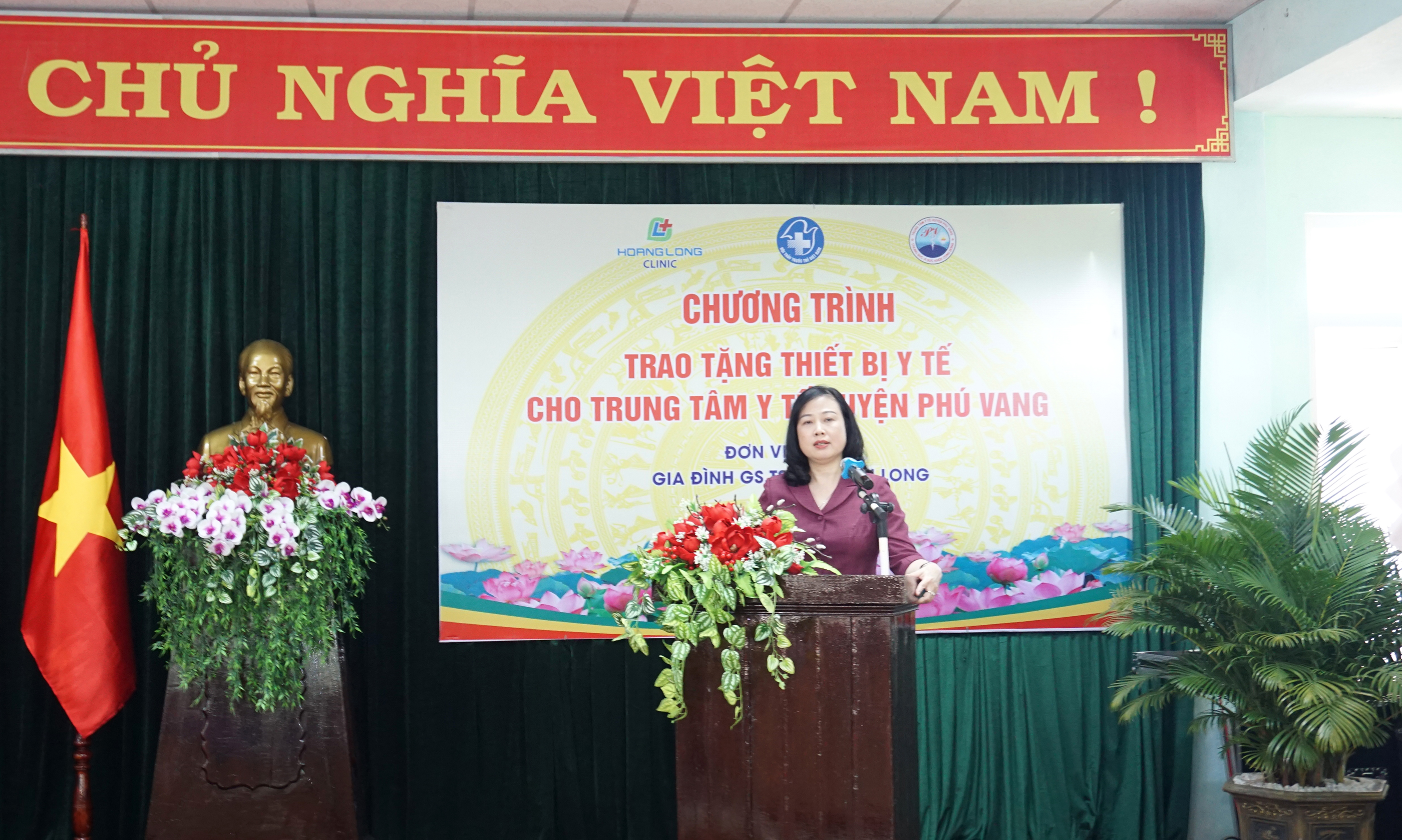 GS. TS Đào Văn Long - Phó Chủ tịch Hội Tiêu hóa Việt Nam phát biểu và bà Phạm Thị Việt Hoa - Chủ tịch HĐQT CTCP Y tế Hoàng Long trao tượng trưng máy Siêu âm Fujifiml Arietta 650 cho TTYT Phú Vang.