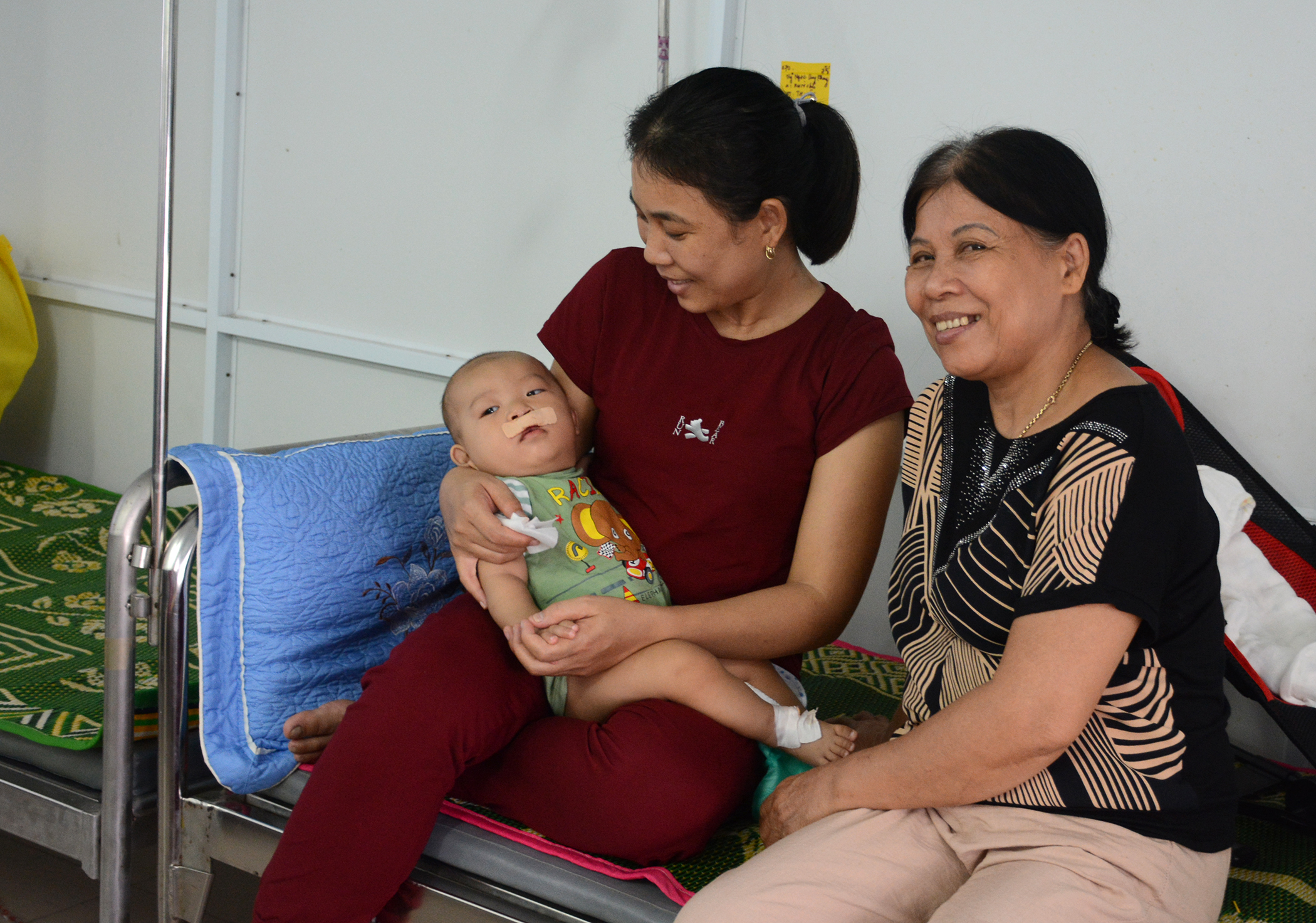 Chị Nguyễn Thị Ngọc Anh (bồng cháu nhỏ) và bà ngoại của trẻ dị tật Nguyễn Duy Ngọc Khang (7 tháng tuổi) ở Phong Hòa, Phong Điền, đưa cháu đến để phẩu thuật tạo hình thẩm mỹ, phục hồi chức năng tâm sự: “Thằng Khang, bị sứt môi hở hàm từ khi mới sinh, cháu là người được khám và được mổ đầu tiên, sau hơn tiếng rưỡi đồng hồ ở trong phòng mổ, các bác sĩ đưa cháu ra cho gia đình, ở môi trên có dán miếng băng để che vết mổ thấy nó vẫn khỏe, không khóc, không la, mấy ngày nay cho cháu ăn bằng ống, cả nhà quá vui mừng và hạnh phúc”. Bà ngoại cháu Khang nói thêm: “Nhờ bác cho tui gửi lời cảm ơn tới các bác sĩ, y tá của Đoàn phẩu thuật và của bệnh viện đã miễn phí toàn bộ chi phí khám và mổ cho cháu, mà còn hỗ trợ tiền mặt cho người nhà ăn uống trong các ngày nuôi bệnh và tiền xe đi/về cho gia đình tui, mấy gia đình ở các tỉnh Kon Tun, Quảng Ngãi, Quảng Nam... cũng có, họ vui mừng lắm”./.