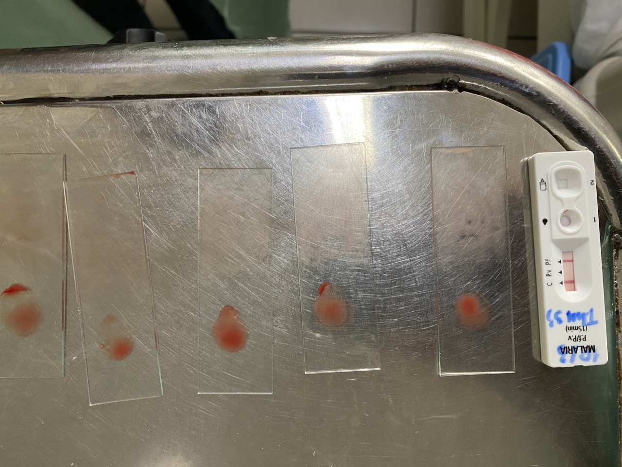 Ngày 10/3/2024 Trung tâm Kiểm soát bệnh tật tỉnh phối hợp làm test chẩn đoán nhanh và lấy máu soi lam, kết quả: test chẩn đoán nhanh dương tính(+) với Plasmodium falciparum, soi lam mật độ KSTSR (++++), không có thể phân liệt. Bệnh nhân được cấp và điều trị thuốc sốt rét ngày đầu tiên, tiếp tục được điều trị và theo dõi những ngày tiếp theo.