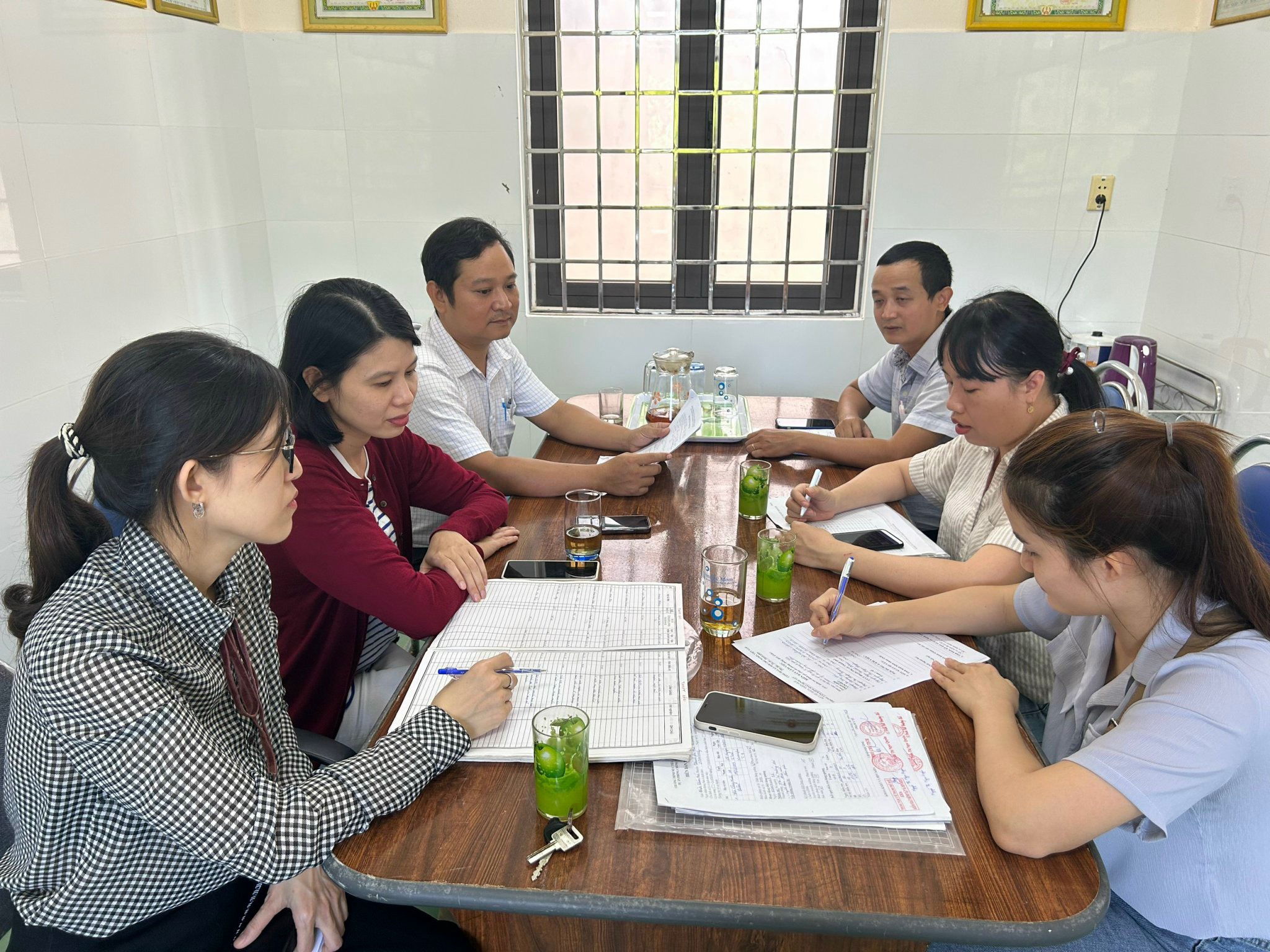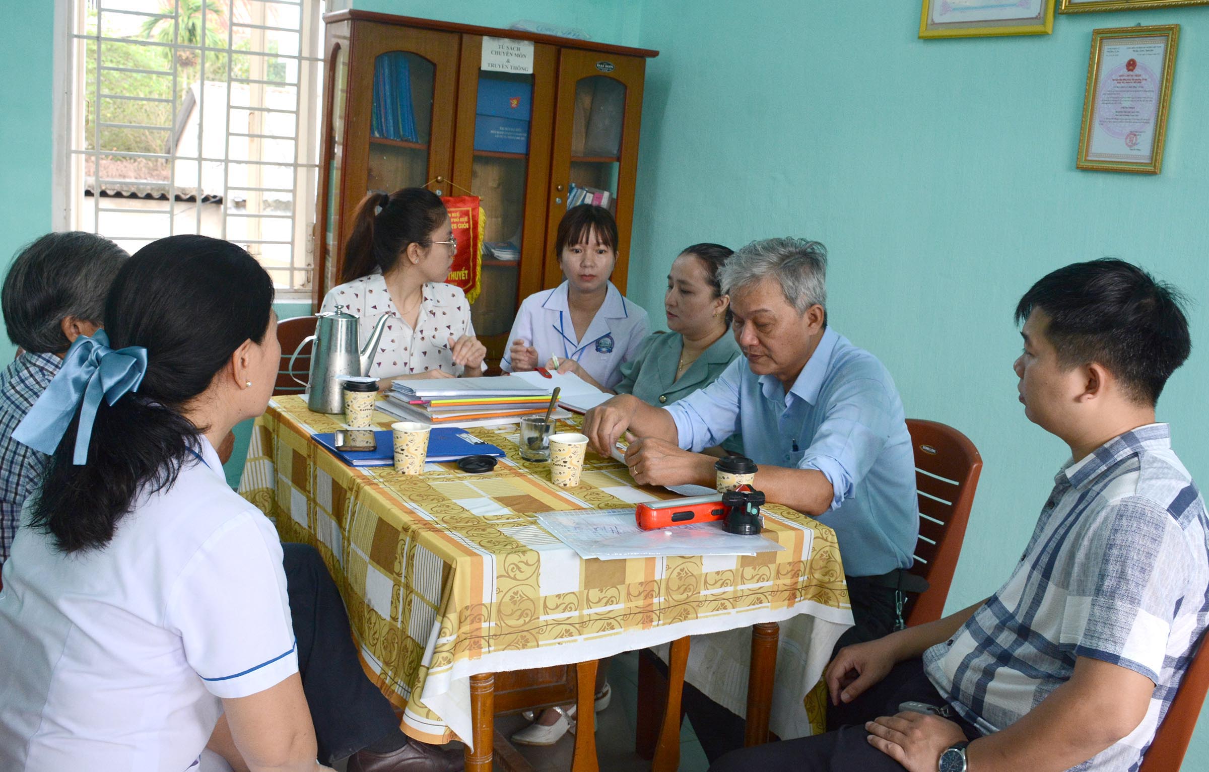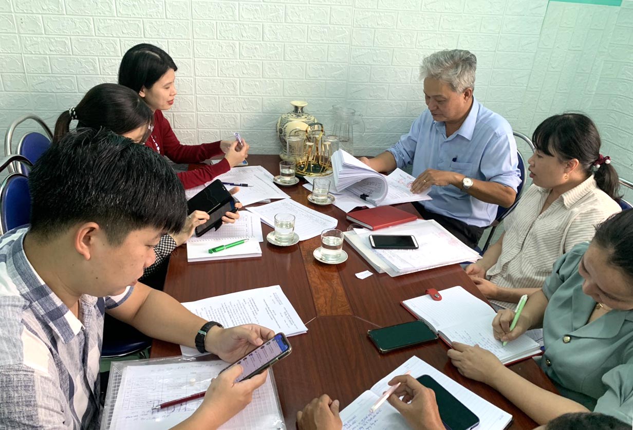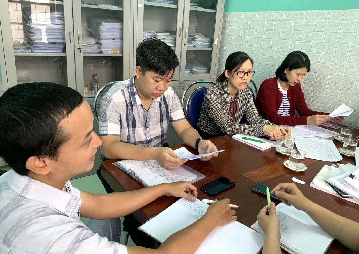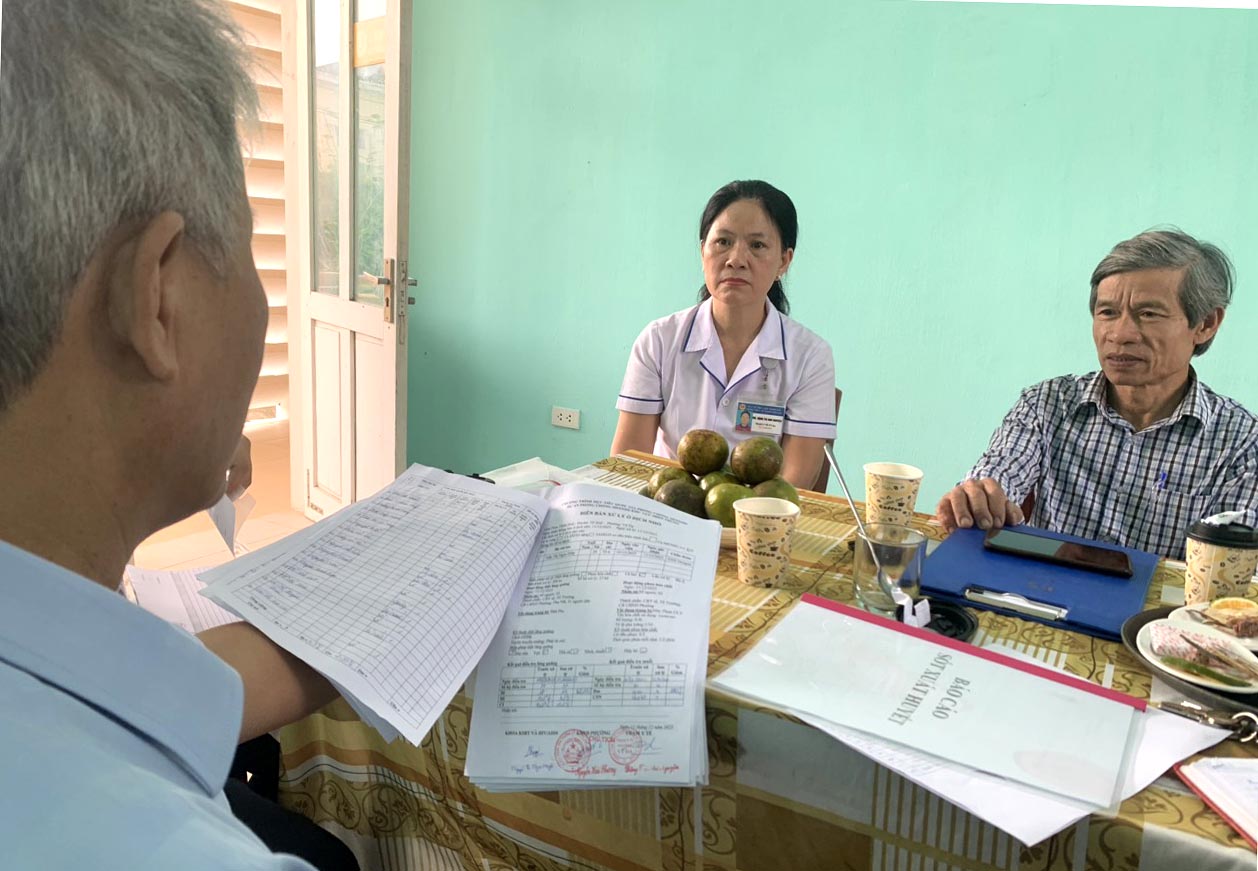 BSCKI Lê Văn Sanh - Trưởng khoa cùng các chuyên trách khoa PCBTN-KSTCT CDC, kiểm tra giám sát hệ thống hồ sơ/sổ sách theo dõi, quản lý dịch bệnh SXH tại khoa Kiểm soát bệnh tật, TTYT thành phố Huế.