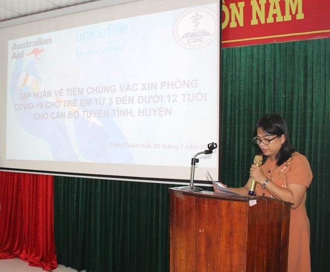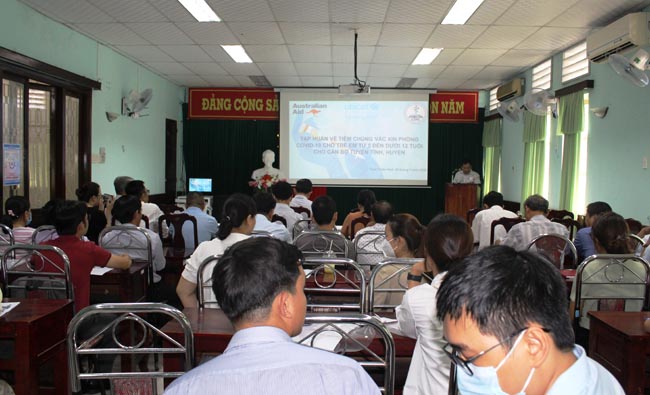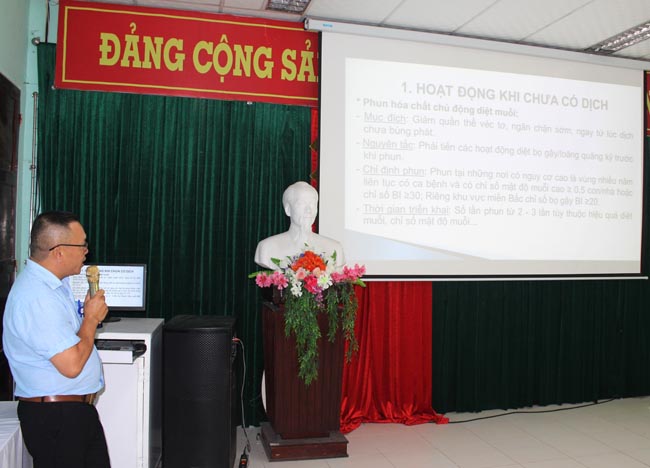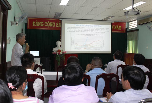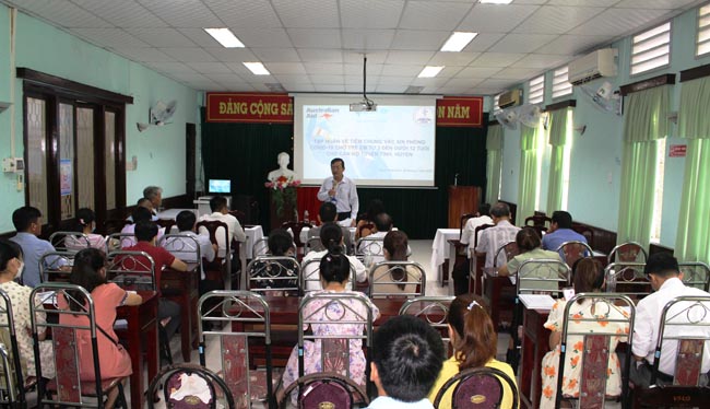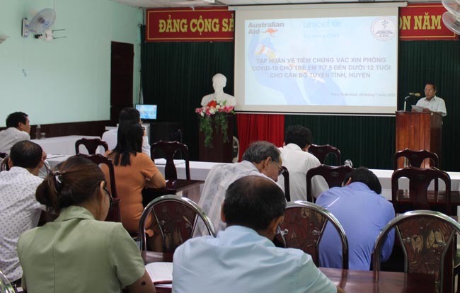 Được sự chỉ đạo của Sở Y tế về đẩy mạnh và tăng cường công tác tiêm vắc xin phòng Covid-19 cho trẻ từ 5 - dưới 12 tuổi và công tác phòng chống sốt xuất huyết trên địa bàn tỉnh. Ngày 29-7-2022, Trung tâm Kiểm soát bệnh tật tỉnh (CDC) tổ chức tập huấn về các nội dung trên, với sự tham dự của Ths.BSCKII Nguyễn Lê Tâm - Phó Giám đốc phụ trách, Trưởng/phó khoa và các chuyên viên của khoa PCBTN-KSTCT, lãnh đạo đơn vị, lãnh đạo khoa KSBT, cán bộ chuyên trách tiêm chủng mở rộng, chuyên trách phòng chống dịch và cán phụ trách công tác tiêm phòng vắc xin Covid-19 của 9 trung tâm Y tế trên địa bàn tỉnh.
