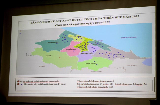 BS.CKI Lê Văn Sanh - Trưởng khoa PCBTN-KSTCT trình bày: Từ đầu năm đến nay cả nước ghi nhận trên 136.420 ca mắc sốt xuất huyết (SXHD) có 44 trường hợp tử vong, so với cùng kỳ năm 2021 số mắc tăng 128%, số tử vong tăng 37 trường hợp. Tại tỉnh Thừa Thiên Huế tính đến ngày 28/07/2022 phát hiện có 466 trường hợp mắc SXHD, trong đó có 64 ca ngoại lai, 01 ca tử vong, có 98 ca bệnh ở trên 54 xã/phường/thị trấn chưa qua 14 ngày. Địa phương có số mắc cao nhất là thành phố Huế 207 ca, Phú Lộc 66 ca. Có gần 30.000 hộ gia đình và 155 cơ quan/trường học ở trên 48 xã/phường/thị trấn đã sử dụng 192 lít hóa chất để xử lý môi trường, diệt muỗi truyền bệnh SXHD tại các ổ dịch.