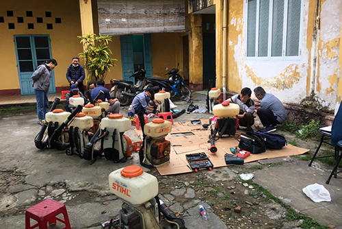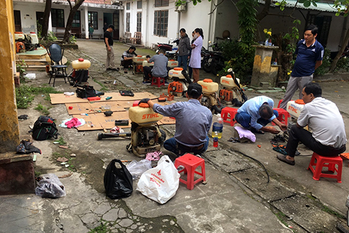 Đoàn công tác của CDC tỉnh do cán bộ khoa PCBTN&KSTCT phối hợp cùng cán bộ kỹ thuật của Tổ vật tư, trang thiết bị Sở Y tế đã có buổi kiểm tra, đánh giá và sửa chữa các máy phun hóa chất phục vụ công tác phòng chống dịch trên địa bàn thành phố Huế. Các máy phun được tập trung tại 2 điểm: khoa Kiểm soát bệnh tật (KSBT) & HIV/AIDS (103 Phan Đình Phùng) và TYT Phú Mậu. Cùng tham gia với đoàn có CBYT của khoa KSBT&HIV/AIDS và TYT của các phường trên.