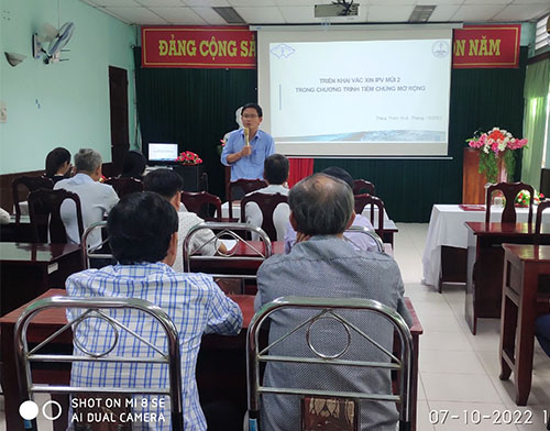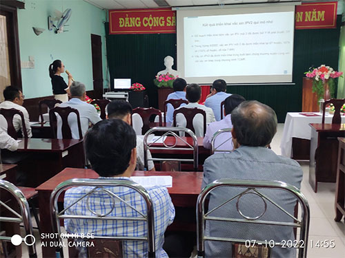 Tiếp theo Ths.Bs. Lê Trần Kỳ Diên, Khoa PCBTN&KSTCT trình bày nội dung Triển khai vắc xin IPV mũi 2 trong chương trình tiêm chủng mở rộng gồm: Căn cứ triển khai vắc xin IPV mũi 2 và qua kết quả triển khai qui mô nhỏ cho thấy việc triển khai vắc xin IPV mũi 2 cho trẻ 9 tháng trong buổi tiêm chủng thường xuyên là khả thi, thuận tiện được các bà mẹ chấp thuận, có thể tiêm IPV2 với vắc xin sởi cho trẻ trong cùng buổi tiêm chủng. Đồng thời đề nghị các đơn vị khẩn trương dự trù vacxin IPV gửi về TTKSBT để trình Sở Y tế ban hành và được viện Pasteur Nha Trang cấp vacxin để triển khai đúng tiến độ; Các đơn vị triển khai tiêm IPV mũi 2 trong tiêm chủng mở rộng từ tháng 10,11/2022 trong buổi tiêm chủng thường xuyên cùng các vắc xin khác trong TCMR. Báo cáo kết quả tiêm IPV2 hàng tháng theo qui định; Rà soát đối tượng tiêm IPV sót tiêm để tiêm vét trong các tháng tiếp theo.