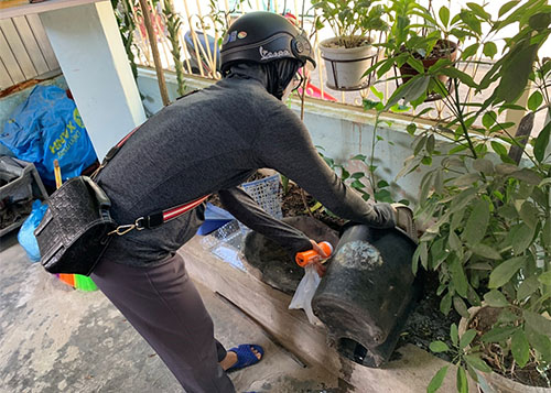 Cán bộ CDC tỉnh và TTYT TP Huế kiểm tra bọ gậy ở các vật chứa phường Tây Lộc (Huế)