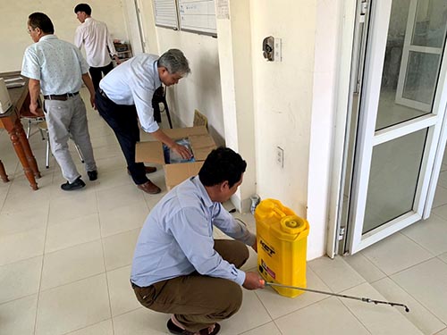 Cán bộ CDC tỉnh kiểm tra vật tư, máy phun tại TTYT huyện Phú Lộc