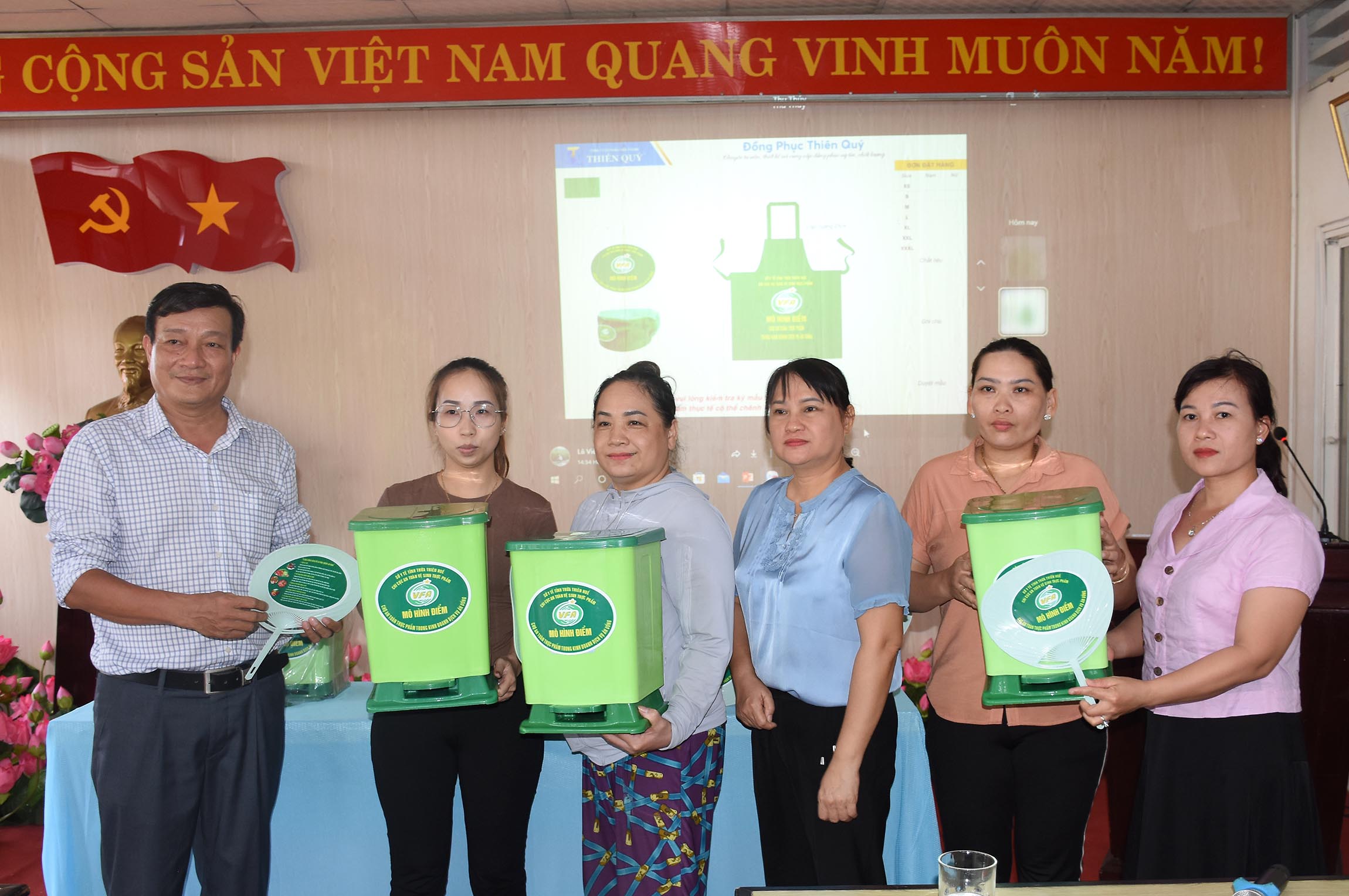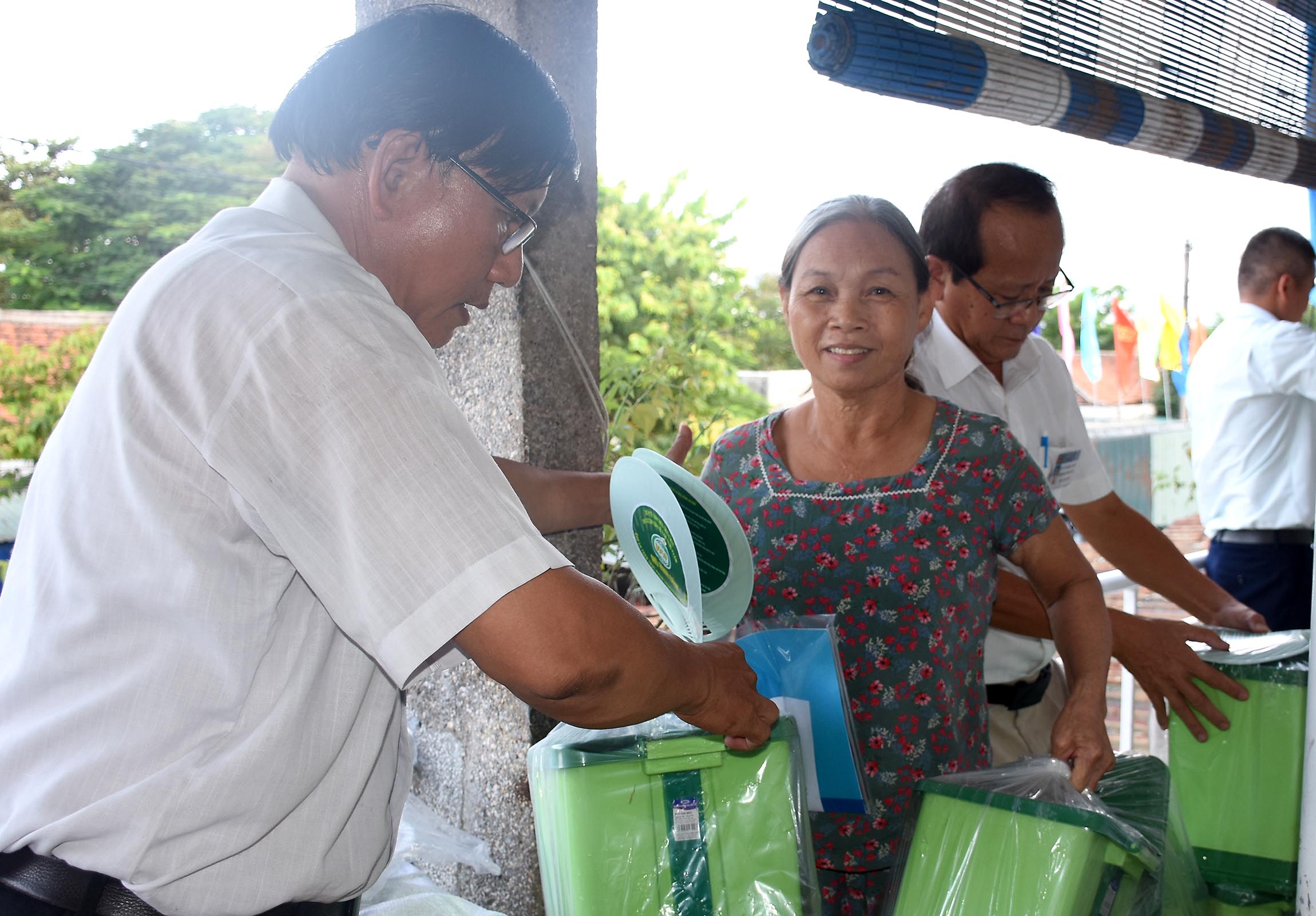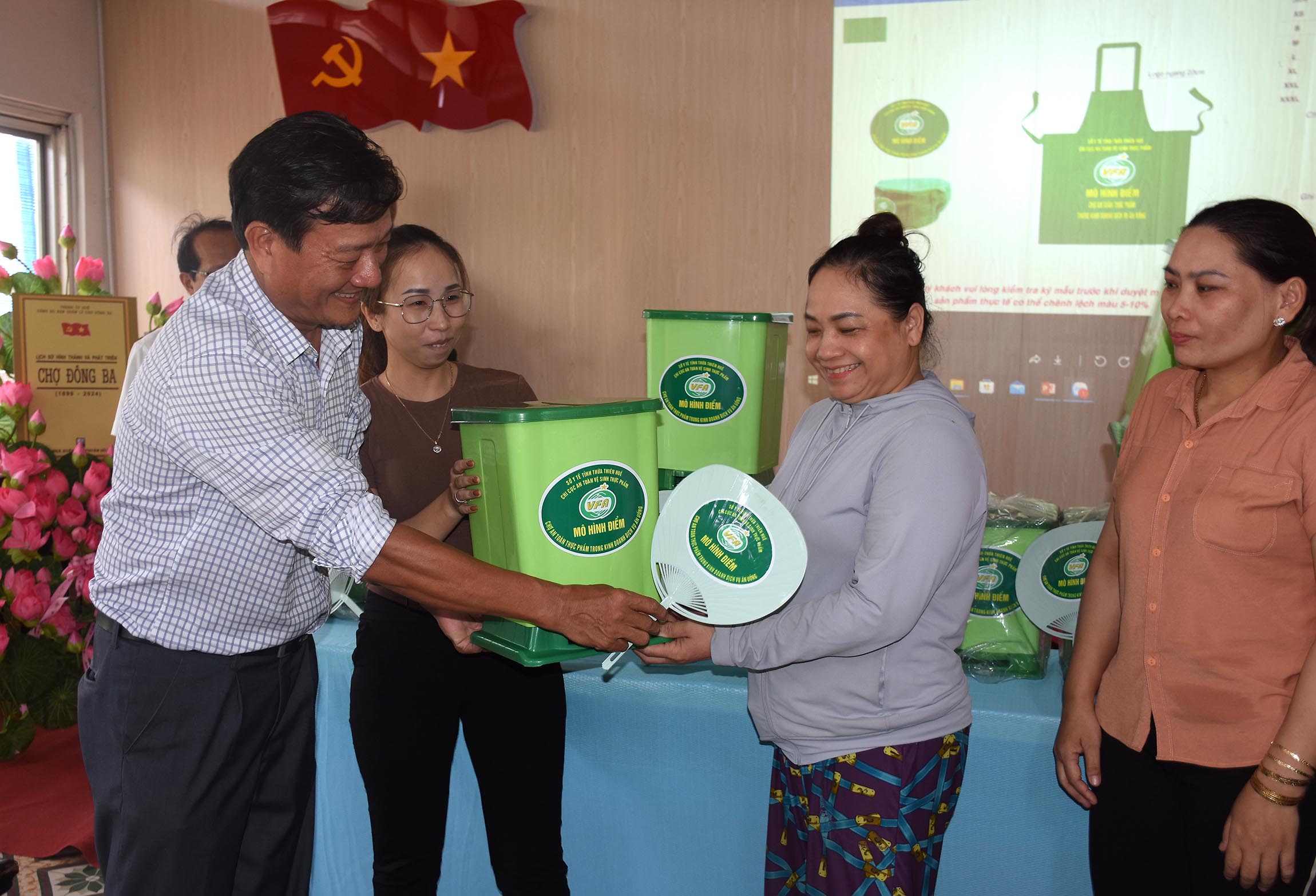 Chi cục ATVSTP hỗ trợ thùng đựng rác thải có nắp đậy cho các hộ kinh doanh dịch vụ ăn uống tại chợ Đông Ba.