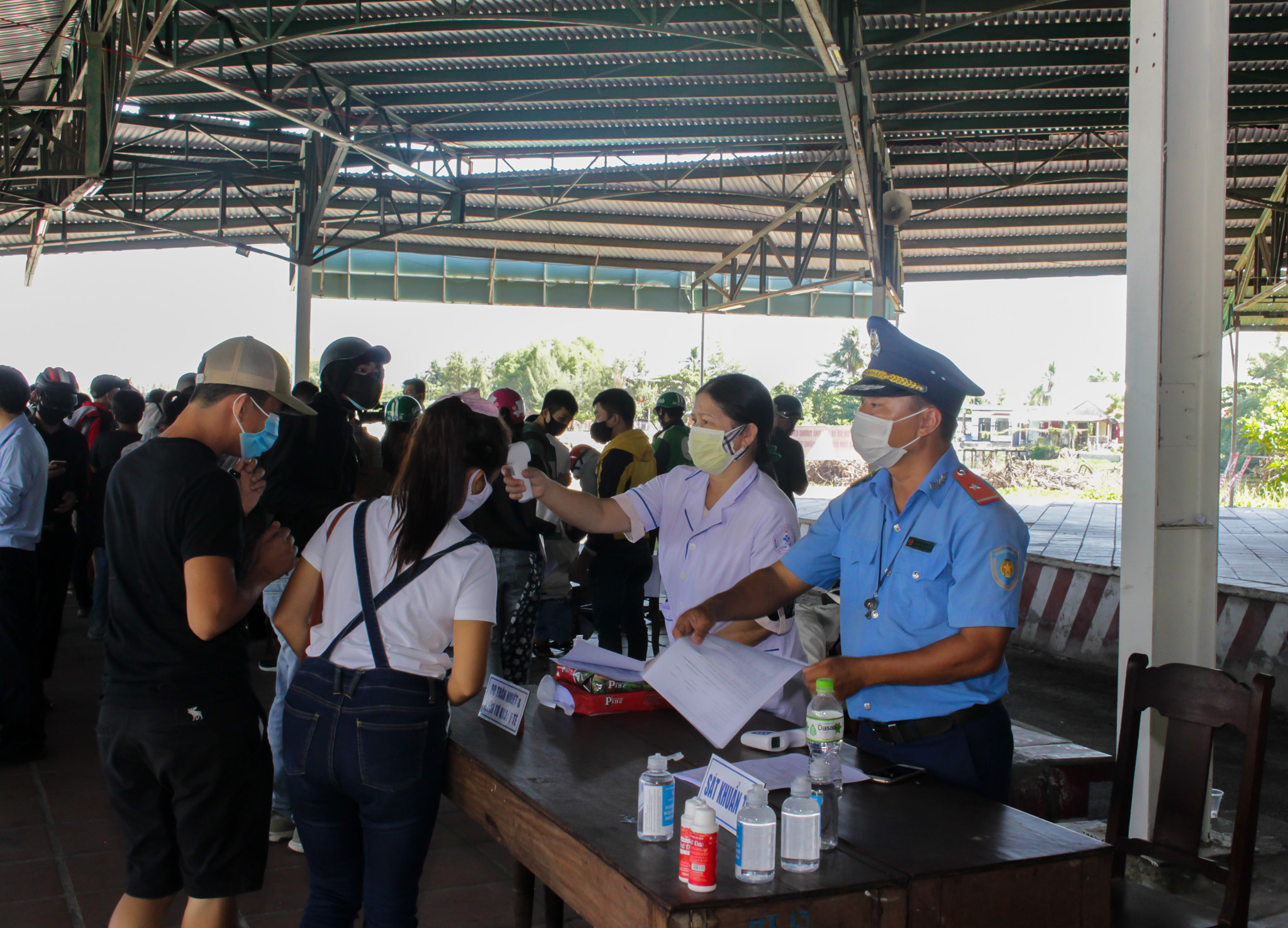 Nhân viên y tế đo thân nhiệt và lấy tờ khai y tế tại chốt số 5, Lăng Cô, huyện Phú Lộc