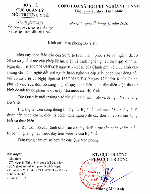 Công bố các cơ sở y tế được cấp phép khám, điều trị bệnh nghề nghiệp