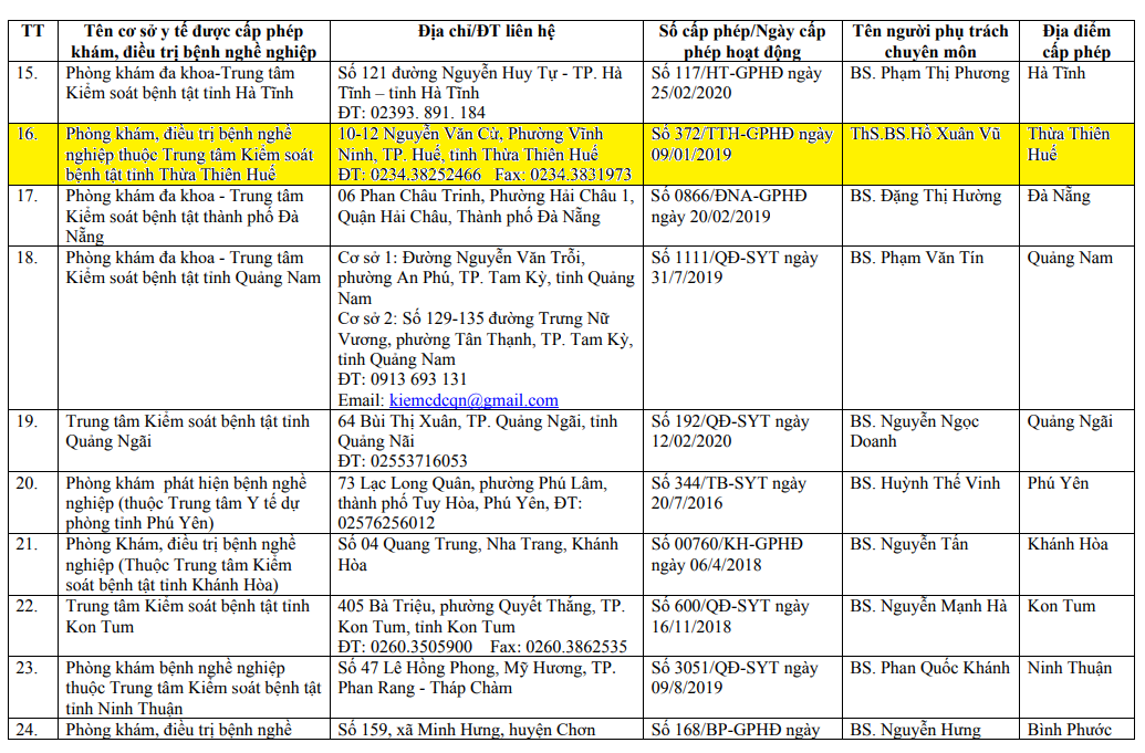 DANH SÁCH CÁC CƠ SỞ Y TẾ ĐƯỢC CẤP PHÉP KHÁM, ĐIỀU TRỊ BỆNH NGHỀ NGHIỆP (Ban hành kèm theo Công văn số 962/MT-LĐ ngày 13 tháng 5 năm 2020)
