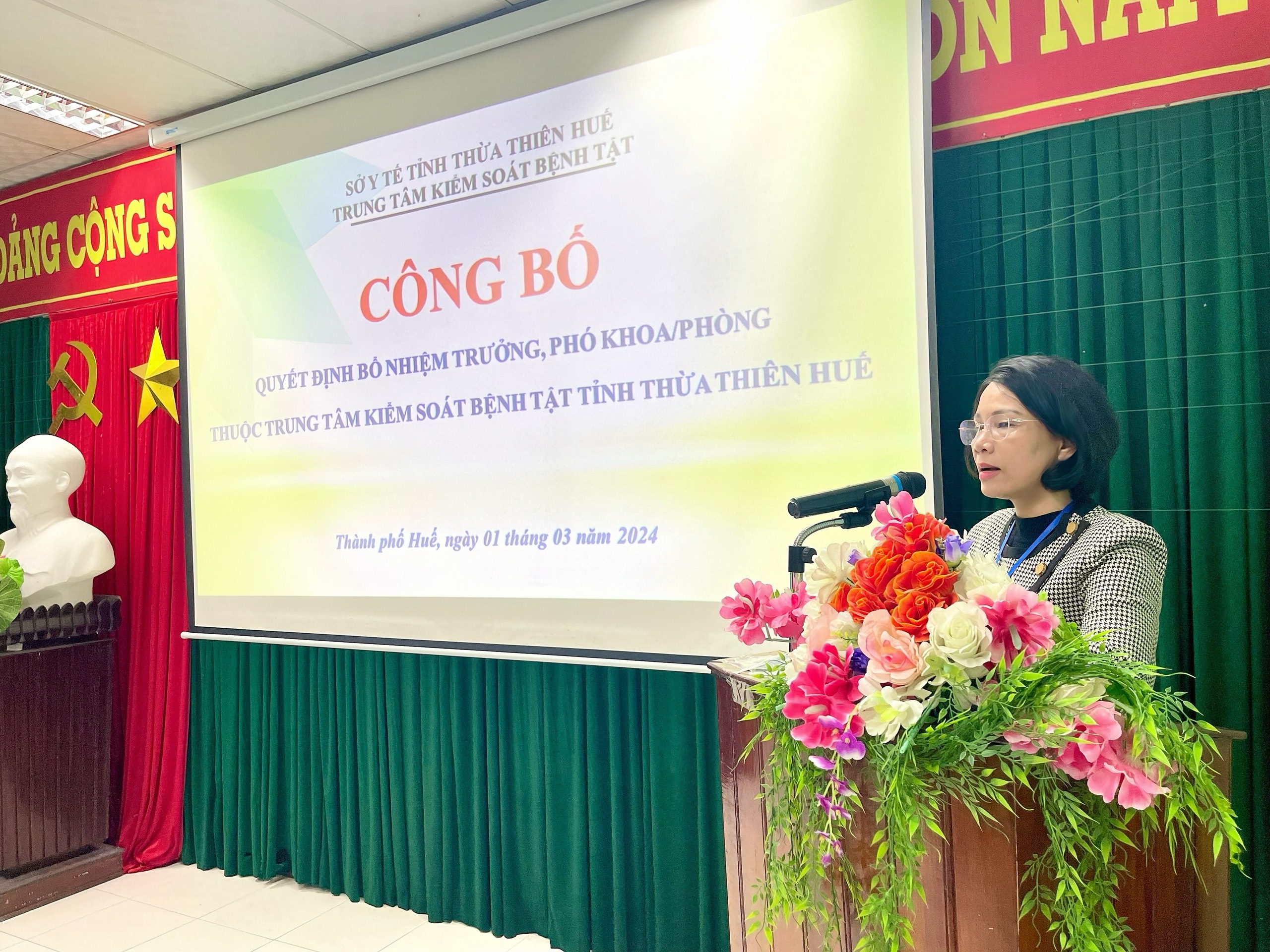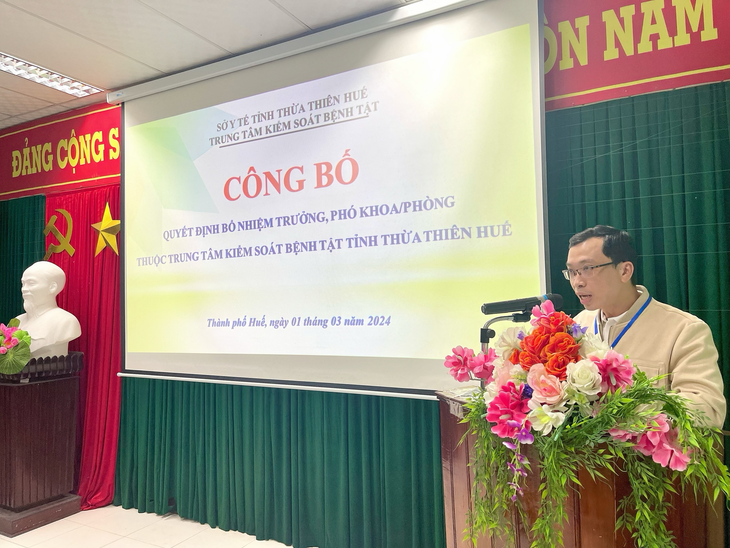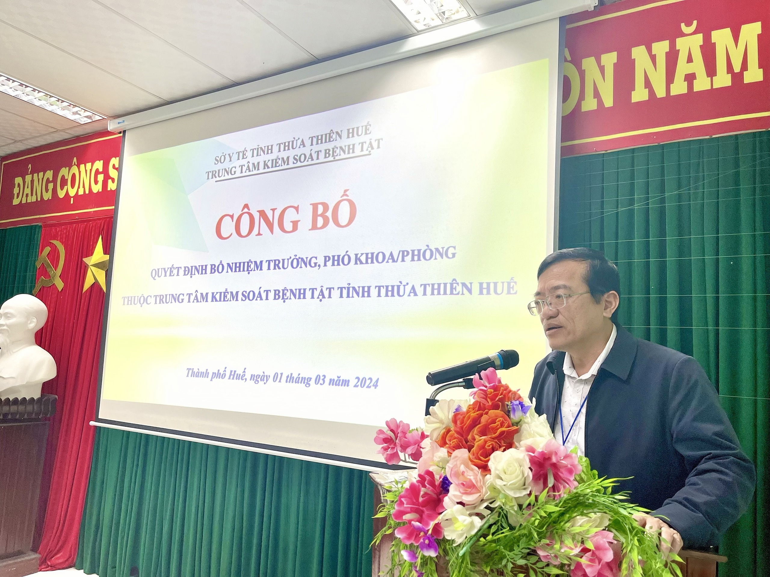 Chiều ngày 01/3/2024, tại hội trường Trung tâm Kiểm soát bệnh tật tỉnh đã công bố và trao Quyết định bổ nhiệm chức vụ Trưởng, Phó trưởng các Khoa/phòng chuyên môn. Tham dự buổi lễ có ThS.BSCKII. Nguyễn Lê Tâm, Phó Giám đốc phụ trách, ThSBS. Hồ Xuân Vũ - Phó Giám đốc, BSCKII. Hoàng Văn Thám - Phó Giám đốc và Trưởng/phó trưởng phòng, cán bộ, chuyên viên các khoa/phòng của đơn vị.