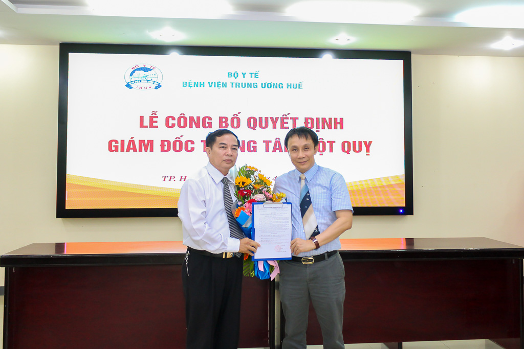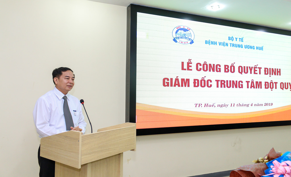 Nhằm triển khai có hiệu quả mạng lưới phòng chống đột quỵ với sự gắn kết giữa Bệnh viện Trung Ương Huế, Sở Y tế và các cơ sở y tế trong địa bàn tỉnh, Giám đốc Bệnh viện Trung Ương Huế đã ban hành quyết định thành lập Trung tâm Đột quỵ và mời TS.BS Nguyễn Nam Hùng - Giám đốc Sở Y tế làm Giám đốc Trung tâm. Tại buổi lễ, Ths Nguyễn Văn Anh- Trưởng phòng Tổ chức Bệnh viện Trung Ương Huế đã công bố Quyết định bổ nhiệm Giám đốc Trung Tâm Đột quỵ.