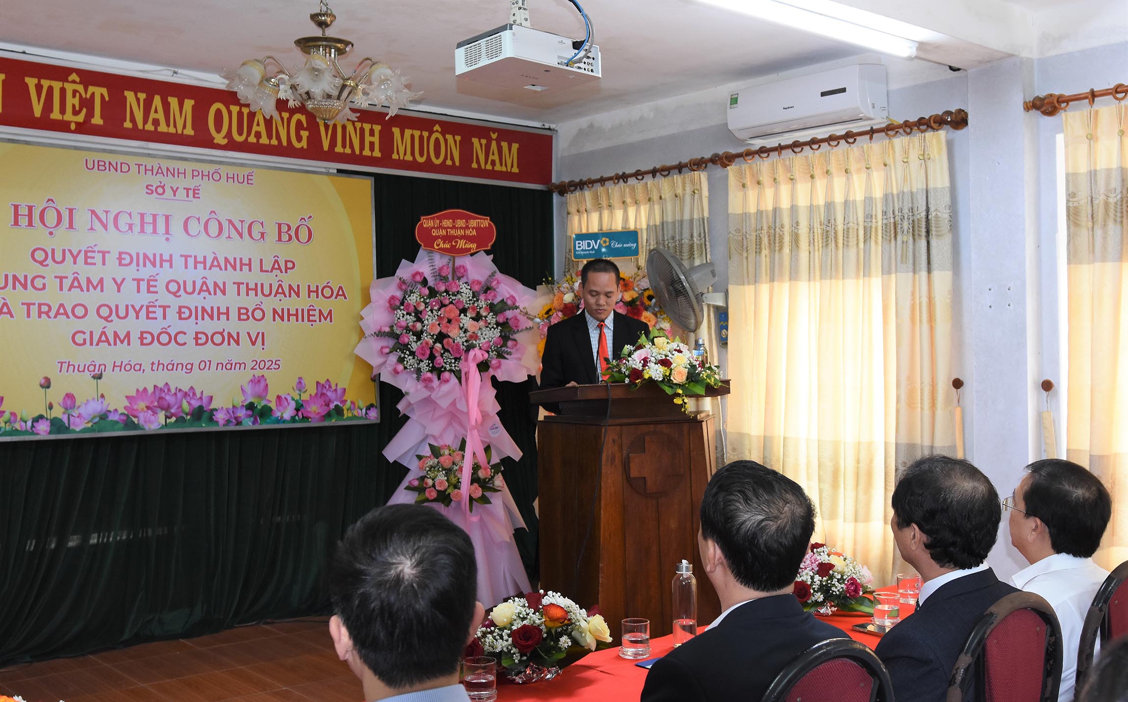 BSCKII Thái Văn Tuấn - Trưởng Phòng TCCB Sở Y tế công bố Quyết định của Chủ tịch UBND tỉnh và của Giám đốc Sở Y tế về thành lập TTYT quận Thuận Hóa và bổ nhiệm các chức vụ Giám đốc/Phó Giám đốc Trung tâm.