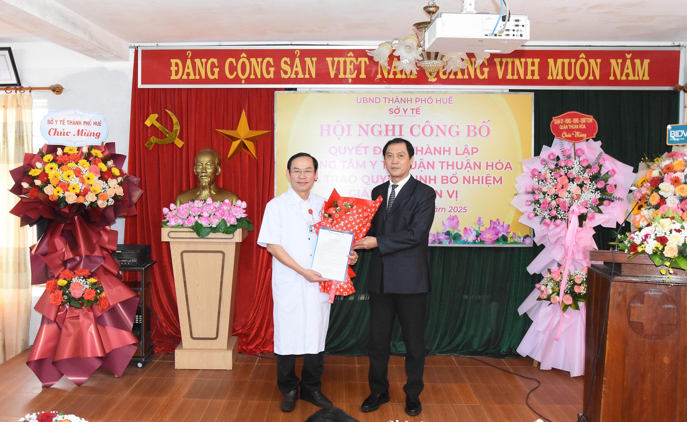 ThS.BS Nguyễn Hoàng Chung - Nguyên là Giám đốc BV Giao thông Vận tải - Huế được Chủ tịch UBND tỉnh Quyết định bổ nhiệm chức vụ Giám đốc TTYT quận Thuận Hóa - thành phố Huế, thời gian bổ nhiệm từ ngày 01/01/2025. Cùng ngày BSCKI Ngô Thành Nhân cũng được Giám đốc sở Y tế Quyết định bổ nhiệm Phó Giám đốc TTYT quận Thuận Hóa từ ngày 01/01/2025.