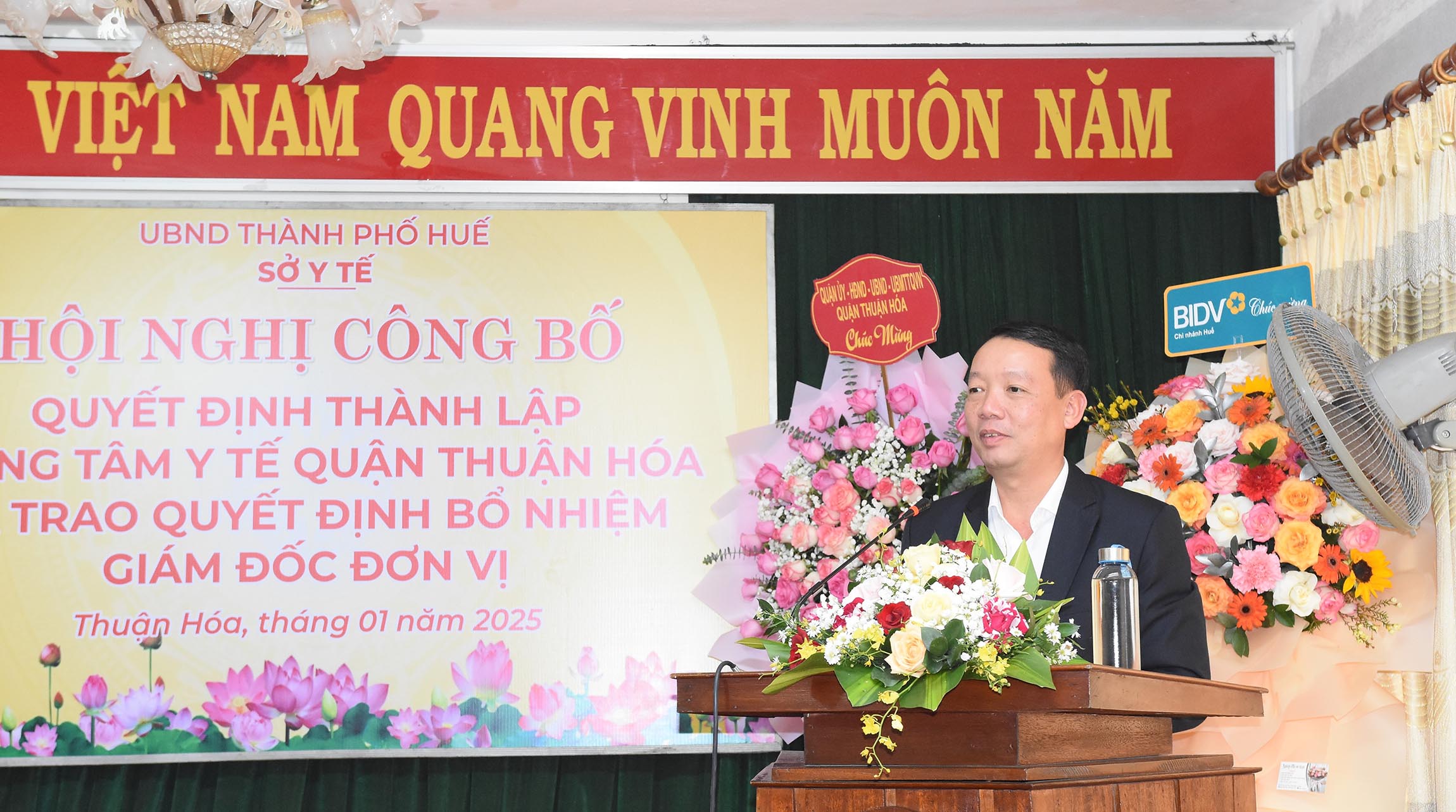 Phát biểu chỉ đạo, lãnh đạo Sở Y tế và lãnh đạo quận Thuận Hóa đề nghị và mong muốn lãnh đạo, cán bộ, viên chức, đội ngũ các cán bộ y tế TTYT quận Thuận Hóa luôn tăng cường mối đoàn kết, cùng thống nhất đồng lòng, nhanh chóng ổn định tổ chức, bố trí công tác phù hợp hiệu quả. Tiếp nhận nhiệm vụ trên tinh thần tự nguyện, tiếp tục phát huy tích tình tích cực, chủ động, những kinh nghiệm sở trường cá nhân, cùng hợp tác phát triển chuyên môn nghiệp vụ, cùng chung lòng hợp sức xây dựng đơn vị ngày càng phát triển vững mạnh, phấn đấu hoàn thành xuất sắc nhiệm vụ chăm sóc sức khỏe nhân dân trong tiến trình đi lên của một thành phố trực thuộc Trung ương.../.