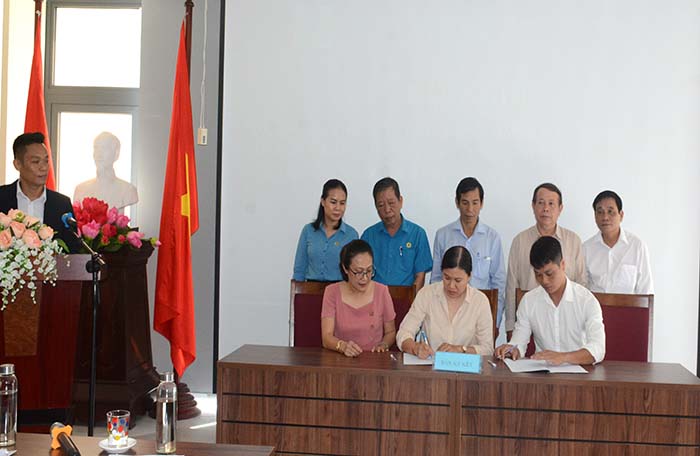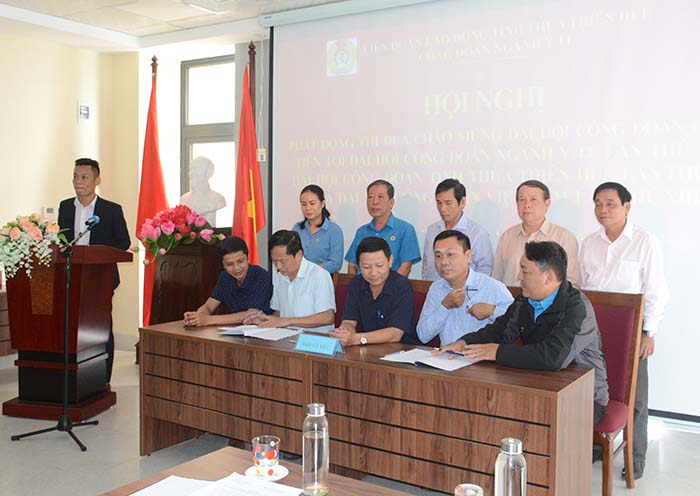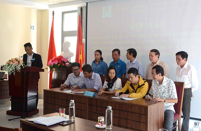 Lãnh đạo Liên đoàn Lao động tỉnh, đại diện Đảng ủy sở Y tế, Chủ tịch và các Phó Chủ tịch Công đoàn ngành Y tế chứng kiến "Ký Giao ước Thi đua" giữa các Công đoàn cơ sở.