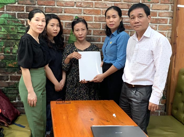 Đ/c Tôn Nữ Thùy Trân (áo xanh) và đ/c Phan Đăng Tâm (áo trắng) - đồng Phó chủ tịch CĐ Ngành trao quỷ "Tương thân, tương trợ" cho người nhà.