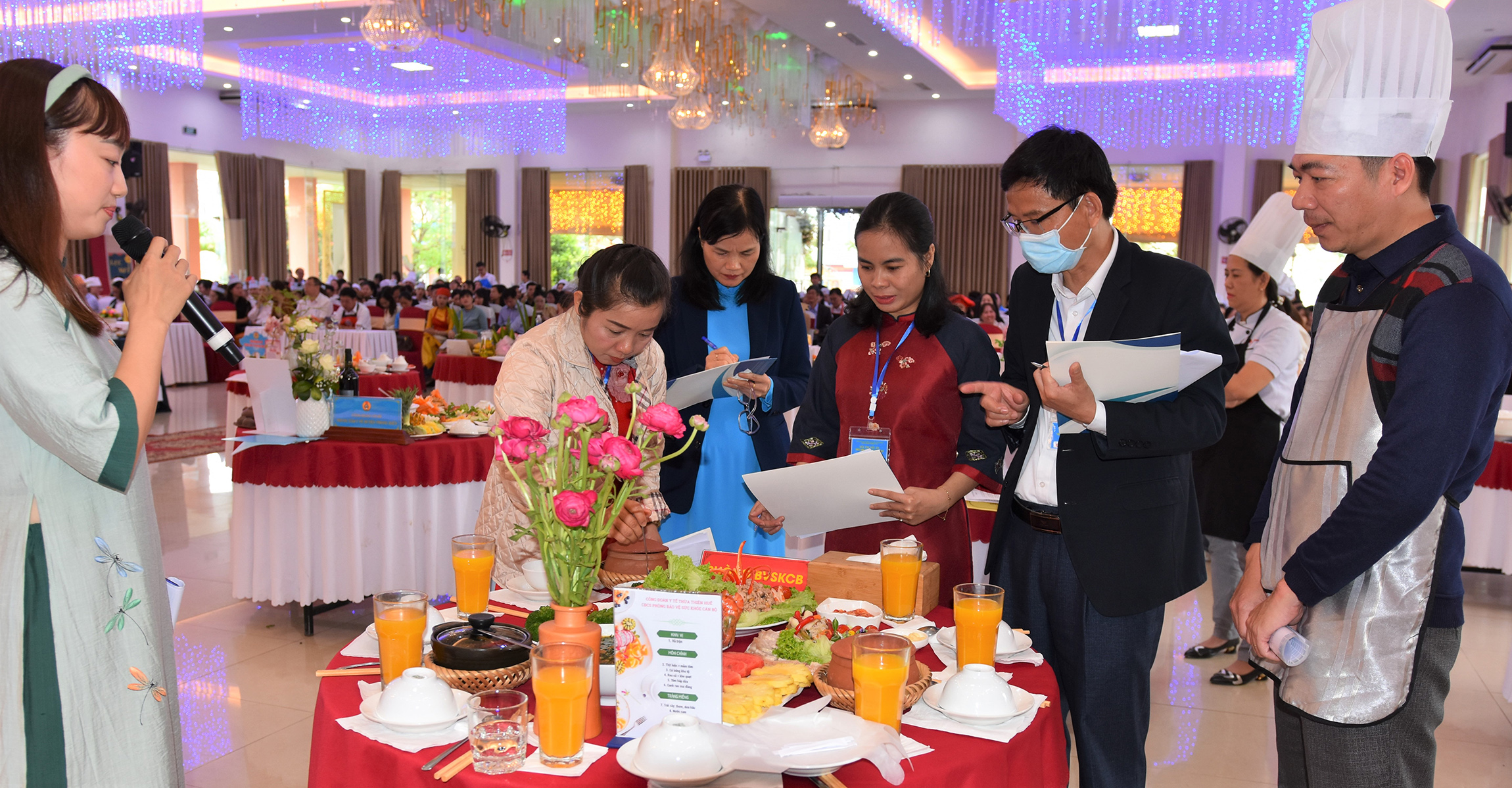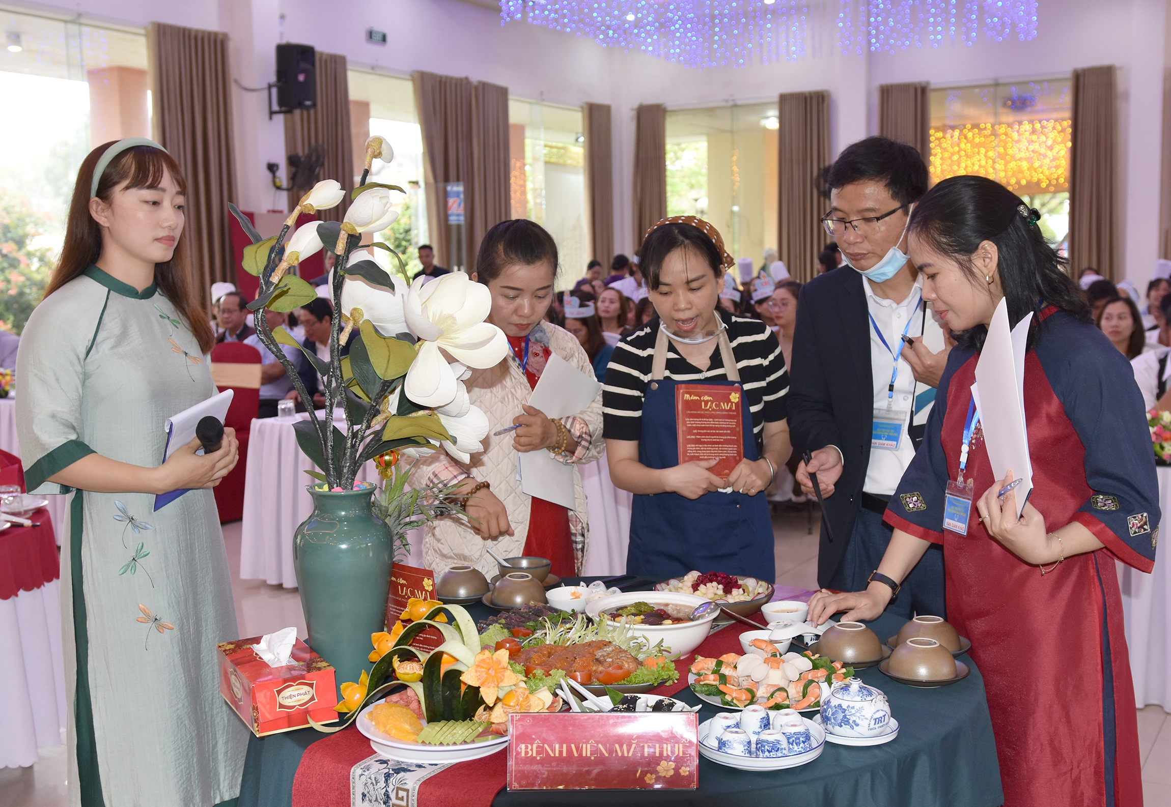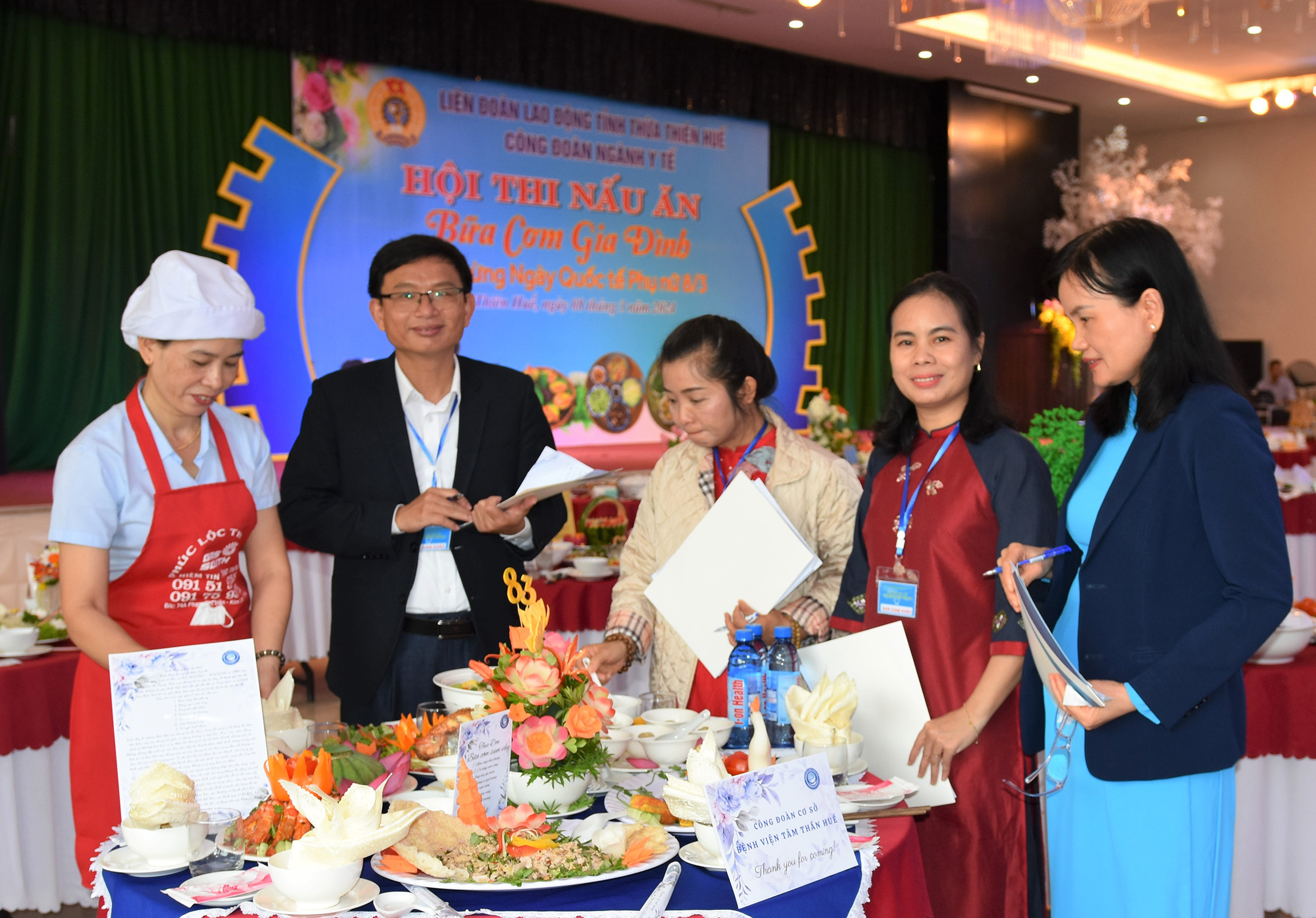 Ban Giám khảo hội thi (từ phải qua): bà Trần Thị Minh Nguyệt - Phó Chủ tịch LĐLĐ tỉnh; bà Tôn Nữ Thùy Trân - Phó Chủ tịch Công đoàn Ngành Y tế; bà Phan Vũ Diệu Bình - Chuyên gia ẩm thực, Giáo viên Khoa Quản trị Chế biến món ăn Trường Cao đẳng Du lịch Huế, ông Hoàng Trọng Quý - Phó Giám đốc Sở Y tế đánh giá chấm điểm các bàn ăn với các tiêu chí: Kỹ năng thực hành, Cân đối dinh dưỡng, Cảm quan món ăn về chất lượng/trang trí, Thuyết trình.