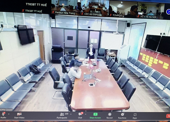 Được sự ủy quyền của Lãnh đạo sở Y tế, tại điểm cầu Trung tâm Kiểm soát bệnh tật Thừa Thiên Huế có BSCKII Hoàng Văn Thám - Phó Giám đốc và chuyên viên các khoa/phòng liên quan của Trung tâm Kiểm soát bệnh tật cùng tham dự hội nghị.