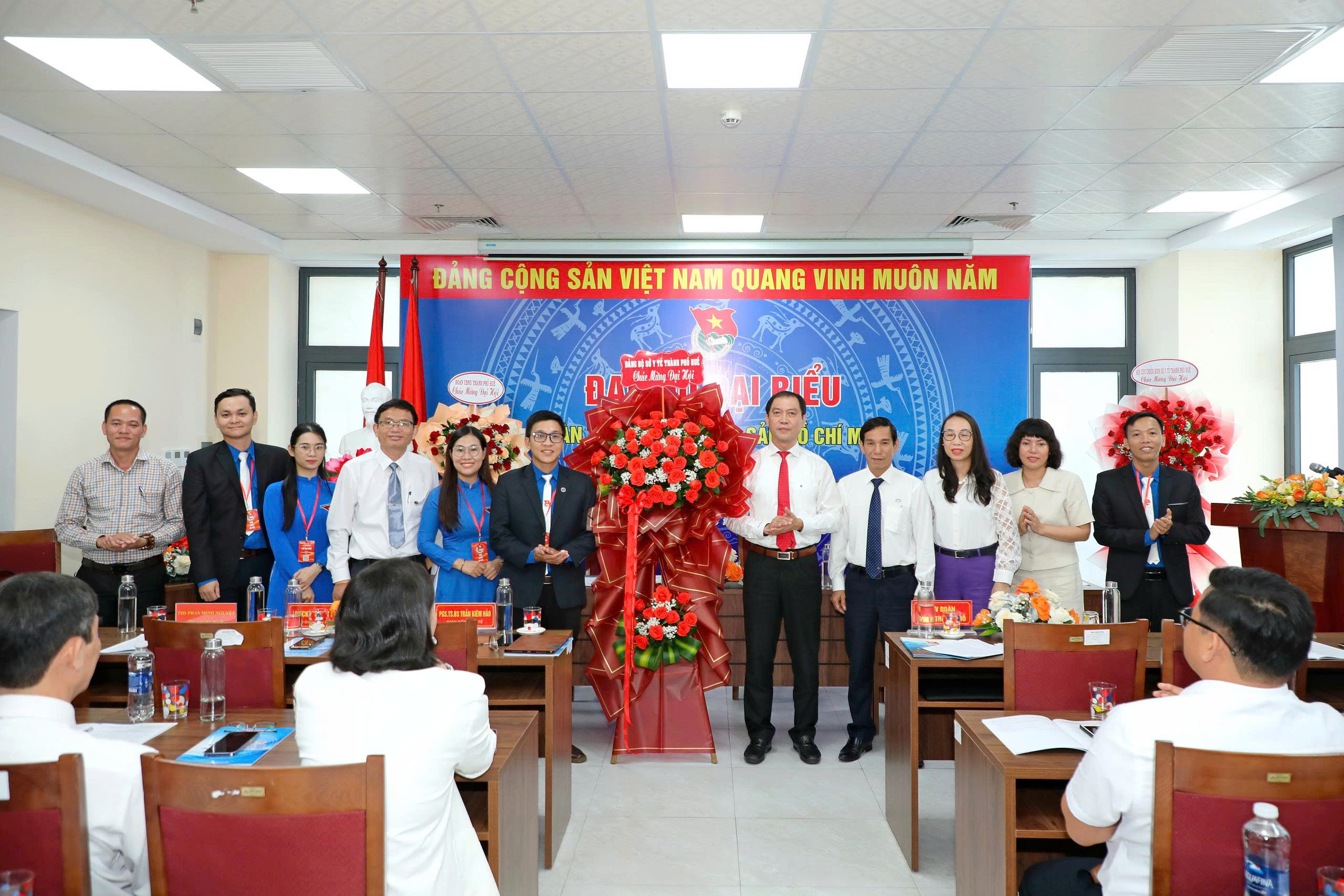 Phó Bí thư Đoàn UBND thành phố Huế và BCH Đảng ủy Sở Y tế tặng của hoa chúc mừng Đại hội