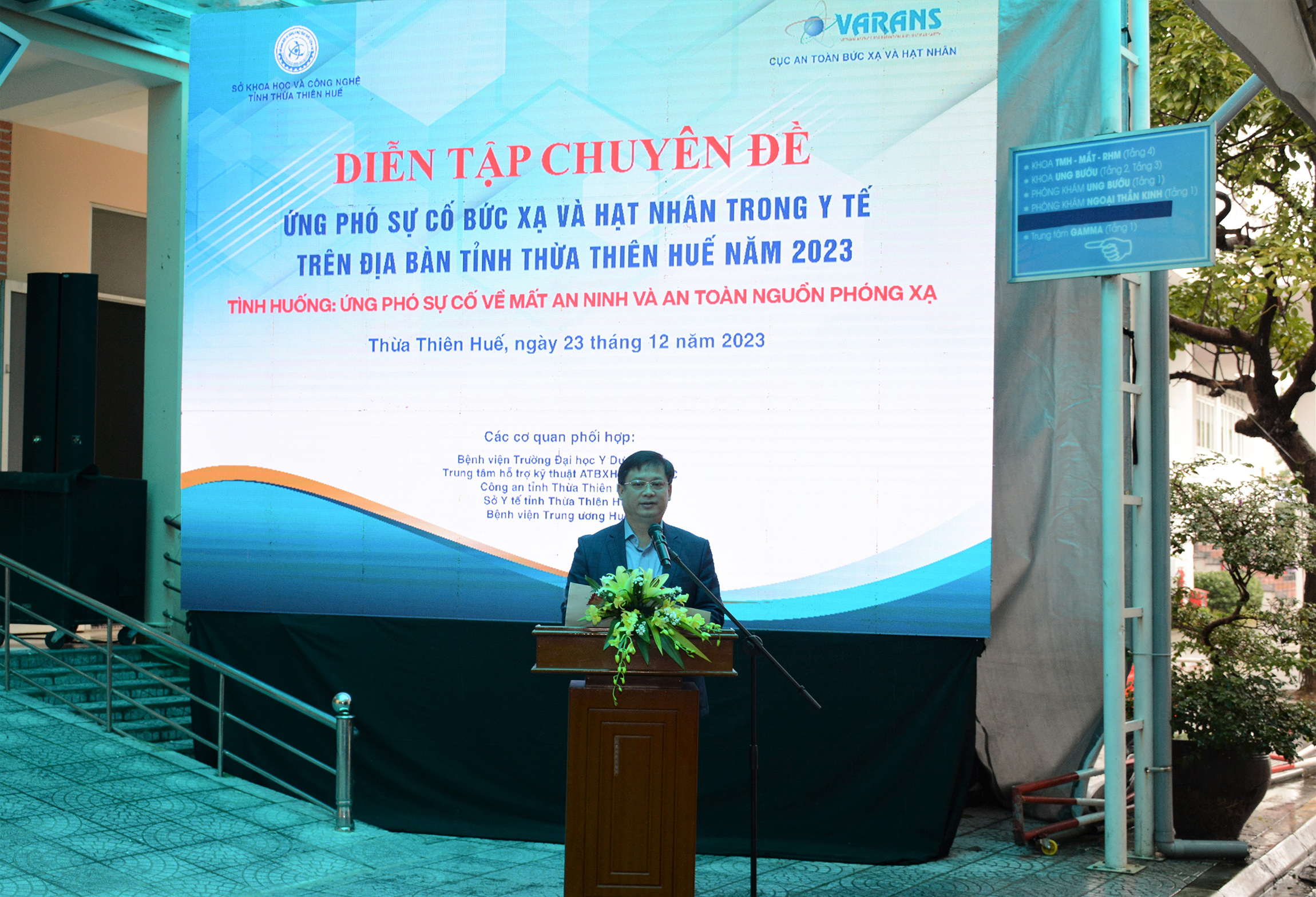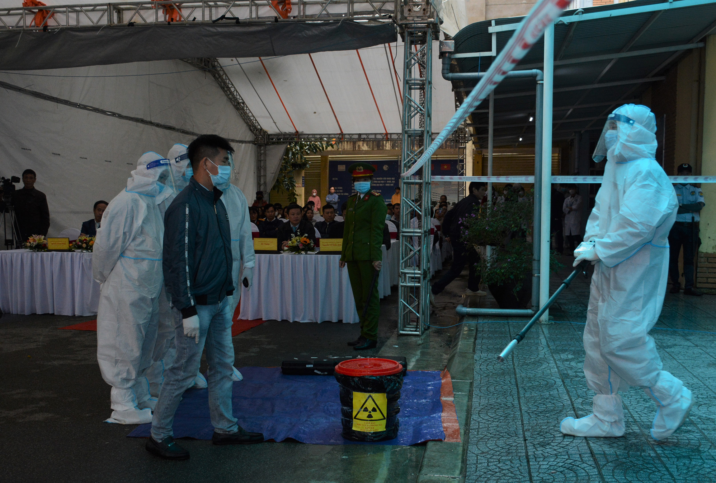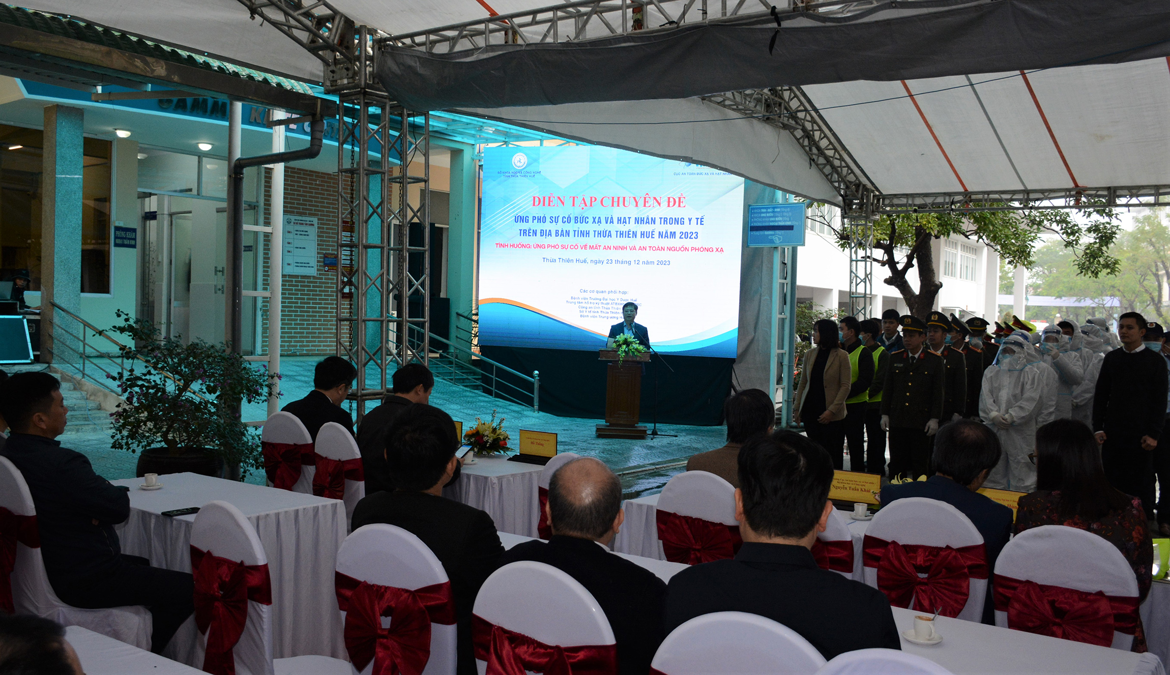 Kịch bản tình huống “Ứng phó sự cố về mất an ninh và an toàn nguồn phóng xạ” được giả định: Trung tâm xạ phẫu bằng Dao Gamma - Bệnh viện Trường Đại học Y Dược Huế (phường Vĩnh Ninh) đang lưu giữ nguồn phóng xạ và được quản lý đảm bảo an toàn, an ninh theo quy định pháp luật. Vào lúc 22h00, qua theo dõi hình ảnh hiển thị từ camera an ninh khu vực lưu giữ nguồn, nhân viên bảo vệ của bệnh viện phát hiện phòng lưu giữ nguồn bị mở cửa, có 3 thanh niên đang có dấu hiệu đập phá các trang bị ở trong phòng, thiết bị an ninh không nghe phát tín hiệu cảnh báo.