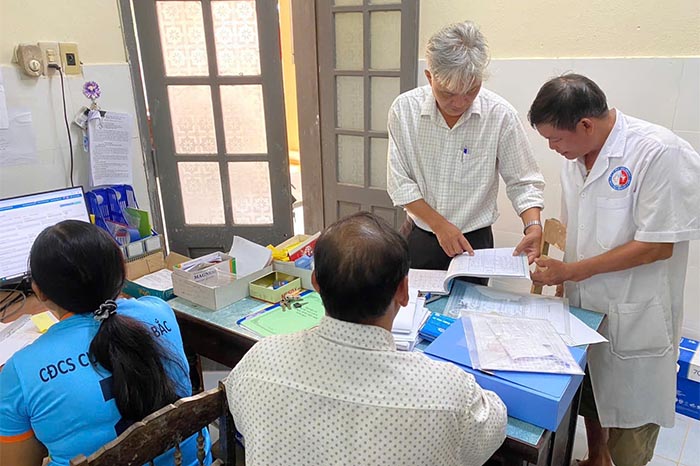 Cán bộ CDC tỉnh kiểm tra, sổ quản lý đối tượng TCMR tại TYT xã Hồng Bắc (A Lưới)