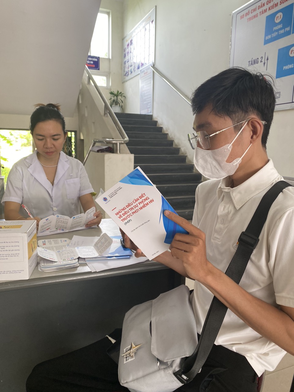 Khách hàng được tiếp đón, tư vấn, thực hiện các xét nghiệm sàng lọc HIV, giang mai, creatinin, HBsAg, Anti-HCV và tư vấn sử dụng miễn phí thuốc ARV điều trị dự phòng trước phơi nhiễm. Mỗi khách hàng được phát thuốc miễn phí (từ nguồn Dự án Quỹ toàn cầu) sử dụng trong vòng 1 tháng và sẽ tái khám, nhận thuốc trong các đợt tiếp theo.
